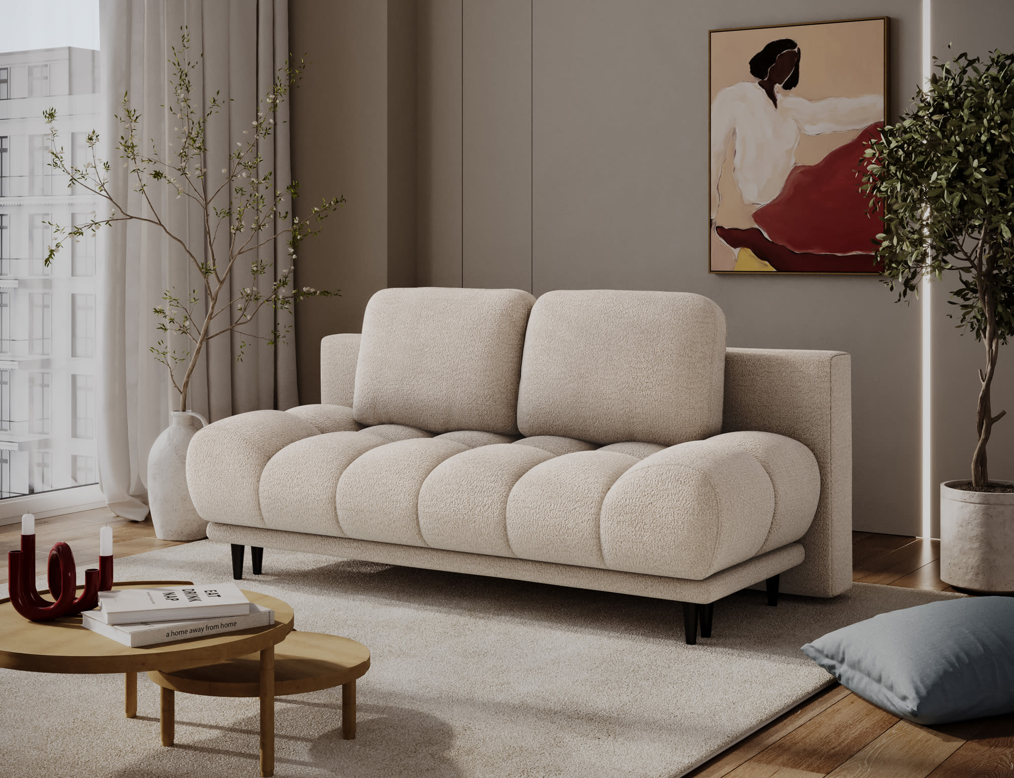 Sofás de dos plazas, mesas redondas y muebles bajos crean amplitud visual.