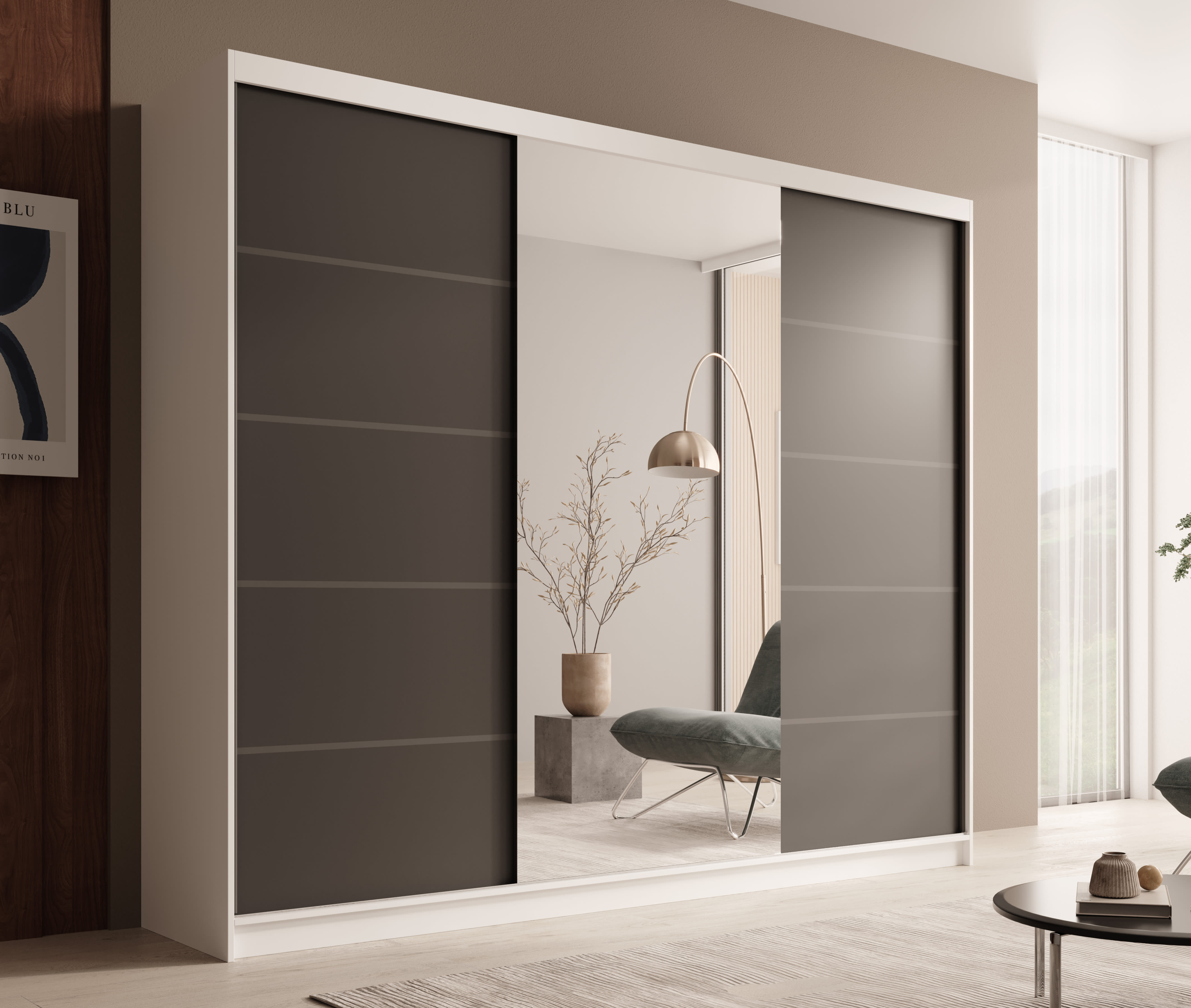 El armario corredero Etna 250 es una solución elegante y funcional para cualquier dormitorio o vestidor. Su diseño moderno se integra a la perfección con diversos estilos de interior, y el gran espejo frontal amplía visualmente el espacio y aporta luminosidad. El armario Etna 250 combina a la perfección estética y funcionalidad, ofreciendo un almacenamiento práctico y organizando tu espacio.