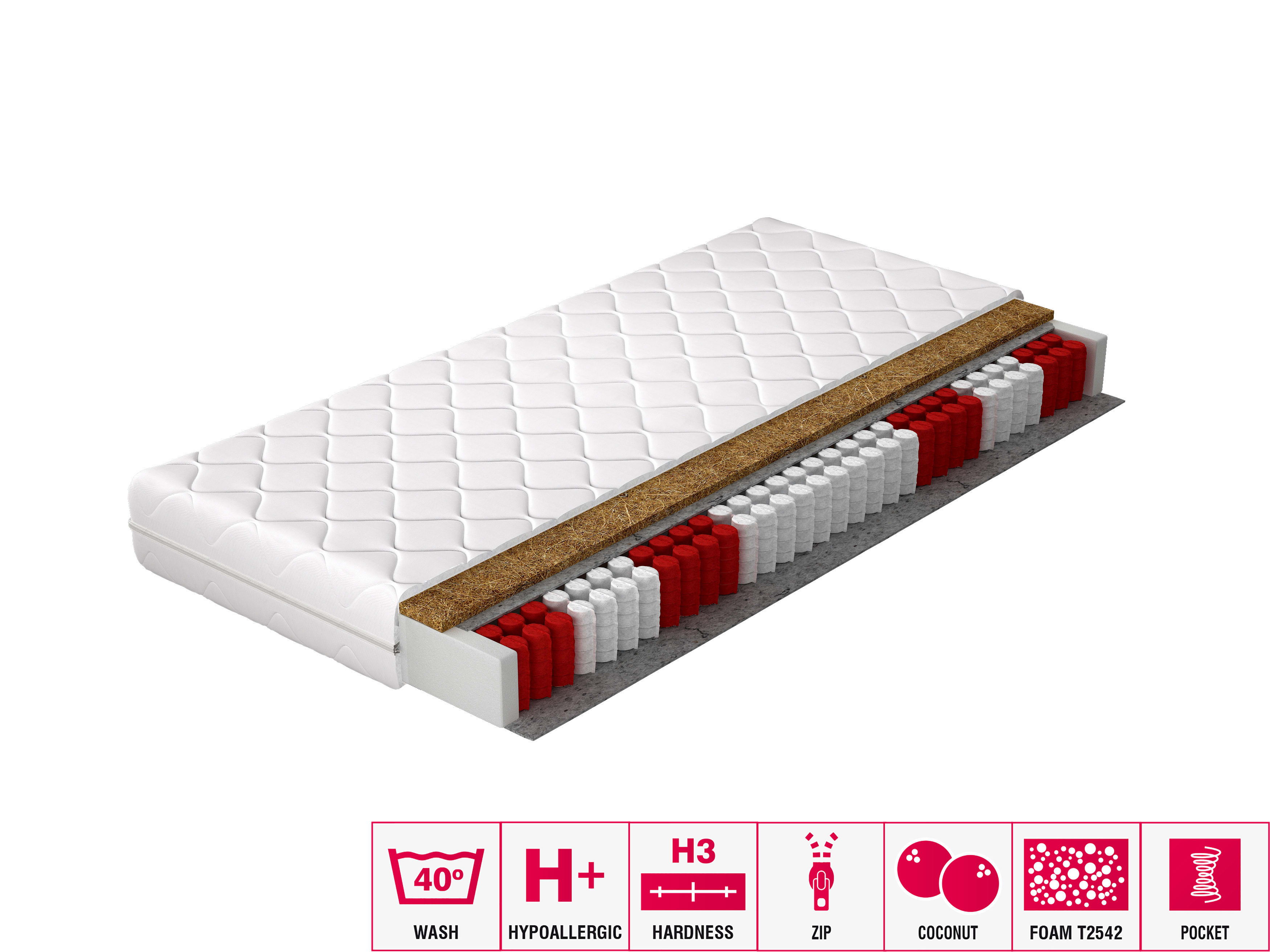 Pasamos 1/3 de nuestra vida en la cama, por lo que sabemos lo importante que es dormir cómodamente. Un descanso perfecto empieza por elegir un buen colchón para dormir. El uso de resortes embolsados en el colchón hace que éste sea elástico y evita que se hunda. Una capa adicional de tablero de coco aumenta su dureza y hace que el colchón no solo sea cómodo, sino también duradero. Todo está envuelto en una funda extremadamente agradable, sedosa y extraíble.