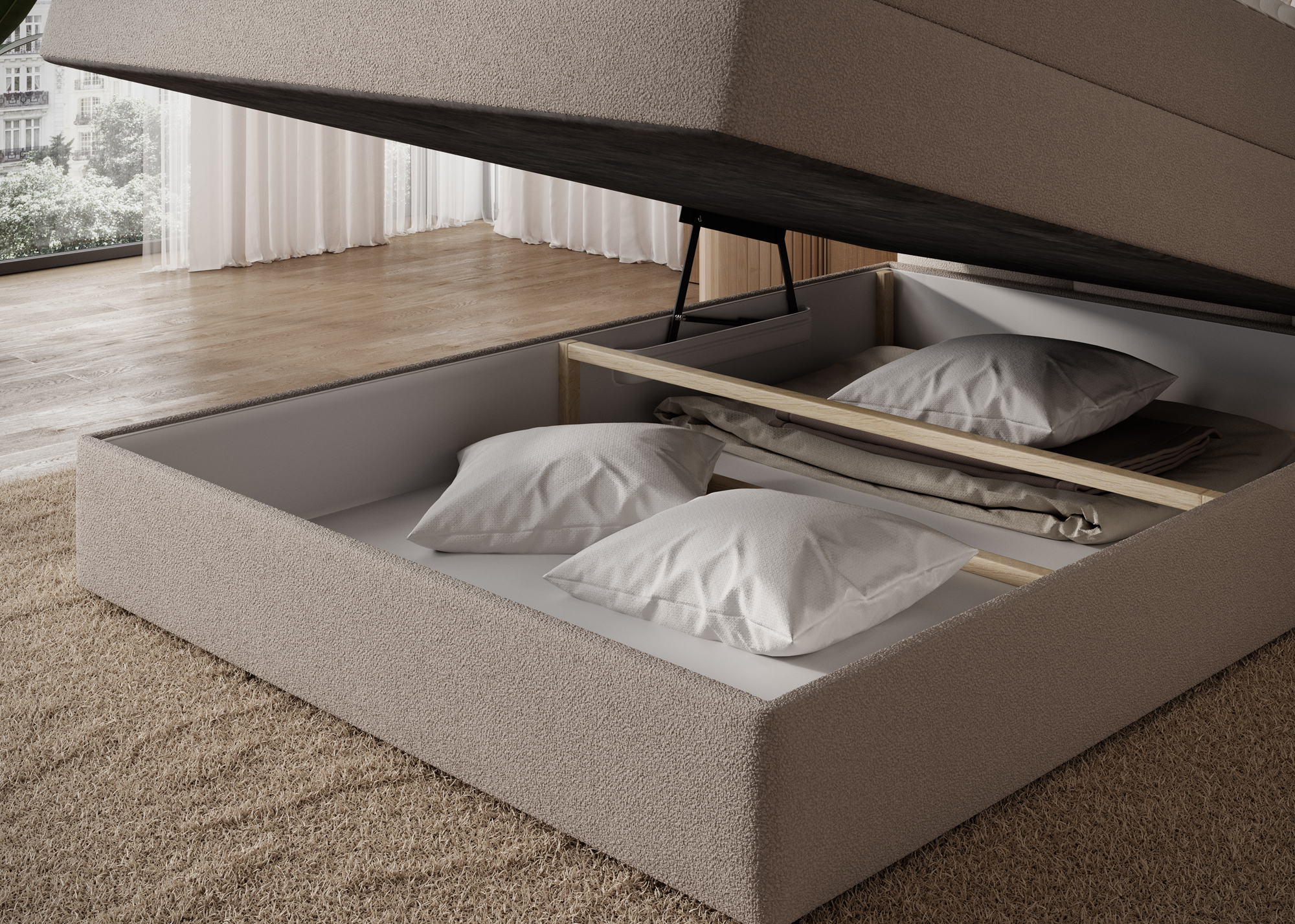 La cama presenta un estilo moderno con líneas sencillas y una forma elegante, complementada por patas negras de plástico resistente, que no solo son estables sino también estéticamente agradables. Un complemento excepcionalmente práctico es el compartimento para ropa de cama, que permite guardar cómodamente edredones, almohadas y demás ropa de cama, ayudando a mantener el dormitorio ordenado. La cama Kasped combina artesanía de alta calidad, estética y funcionalidad, lo que la hace ideal tanto para interiores modernos como clásicos. Dimensiones: