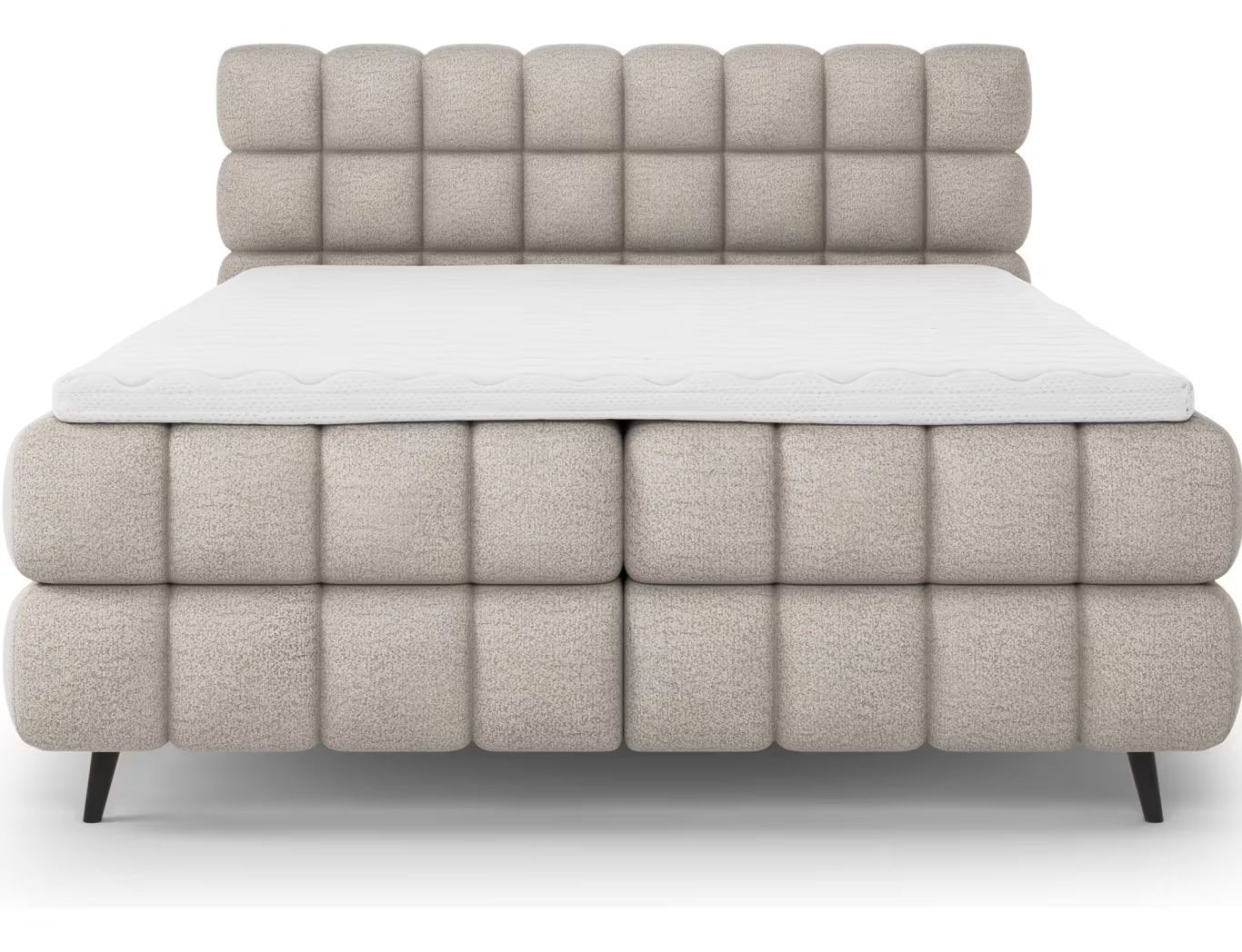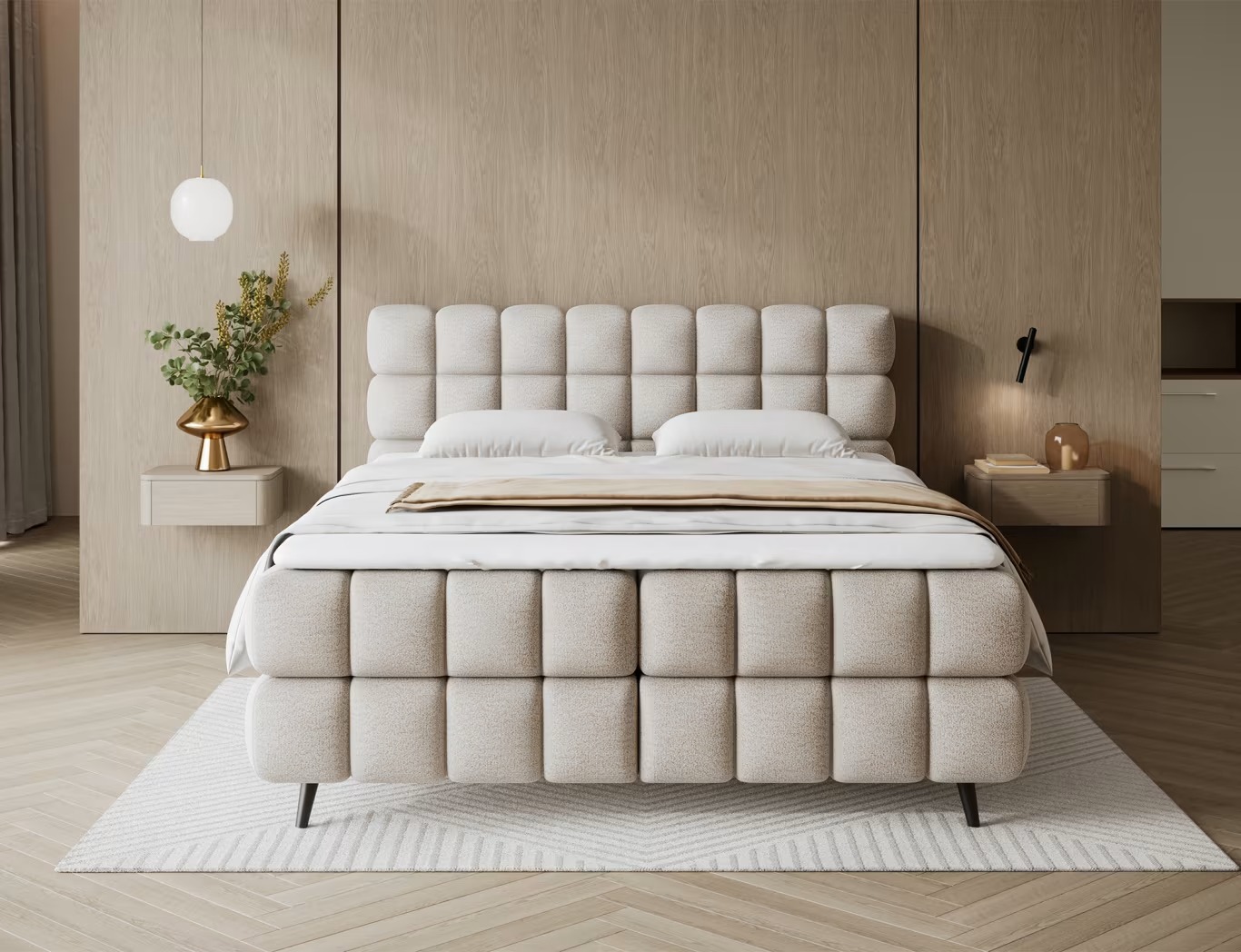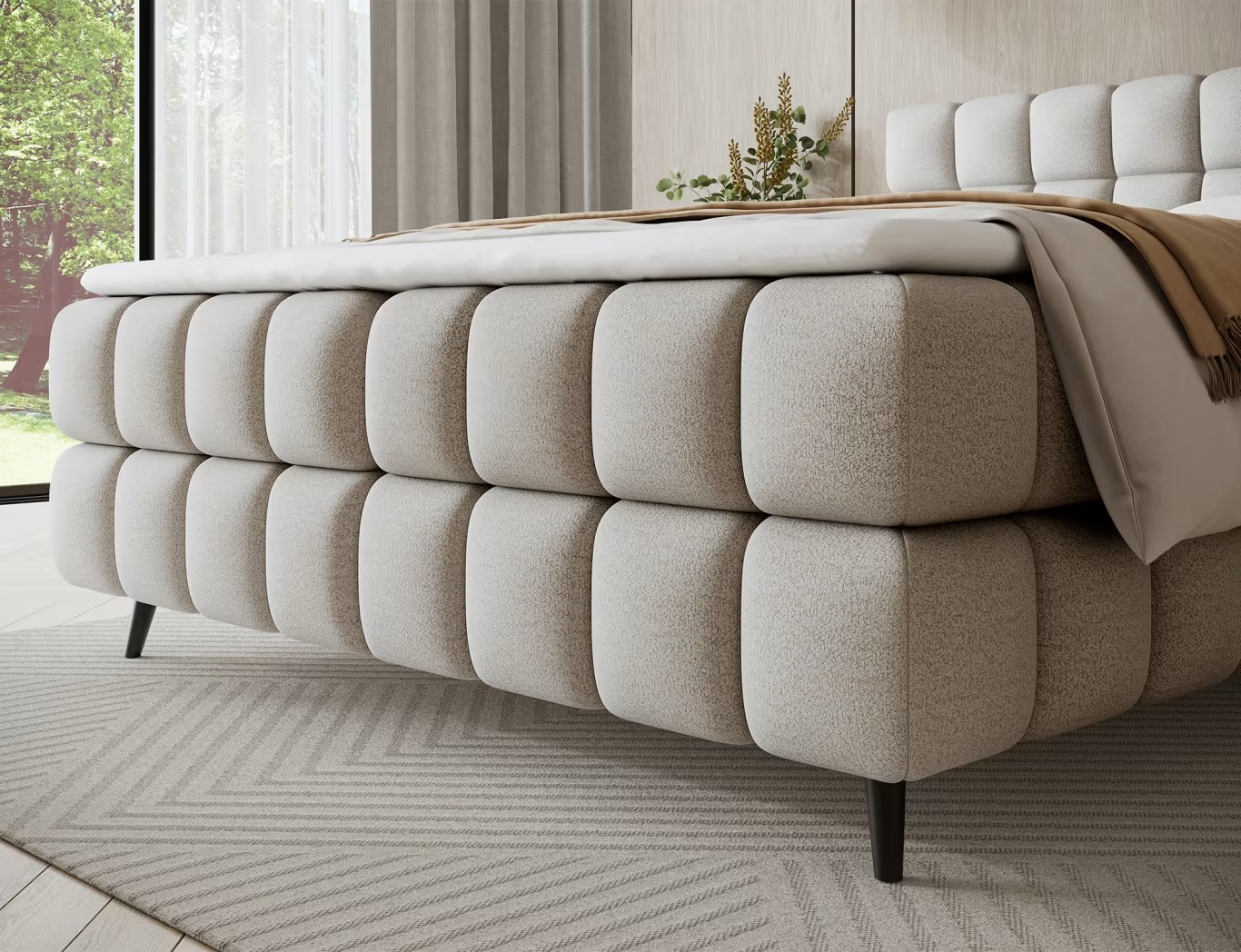 La cama continental Sabeno es una opción elegante y funcional para cualquier dormitorio moderno. Disponible en tres tamaños: 140 x 200 cm, 160 x 200 cm y 180 x 200 cm, su anchura se puede ajustar según las necesidades individuales. La altura total del marco es de 111 cm y su profundidad de 222 cm, lo que le confiere una apariencia estable e imponente. La comodidad al dormir está garantizada gracias a la combinación de muelles Bonell y espuma T2540, que garantizan un soporte adecuado y una gran durabilidad. La cama Sabeno cuenta con un práctico compartimento para la ropa de cama que facilita la organización del dormitorio. Sus patas de madera negra complementan el diseño, aportando a la estructura una sutil elegancia y ligereza. El diseño moderno de la Sabeno la convierte en la opción perfecta tanto para interiores minimalistas como para los más expresivos. Combinando funcionalidad, materiales de alta calidad y un acabado estético, la cama continental Sabeno es la opción ideal para quienes valoran la comodidad, la durabilidad y un estilo moderno en sus muebles de dormitorio.