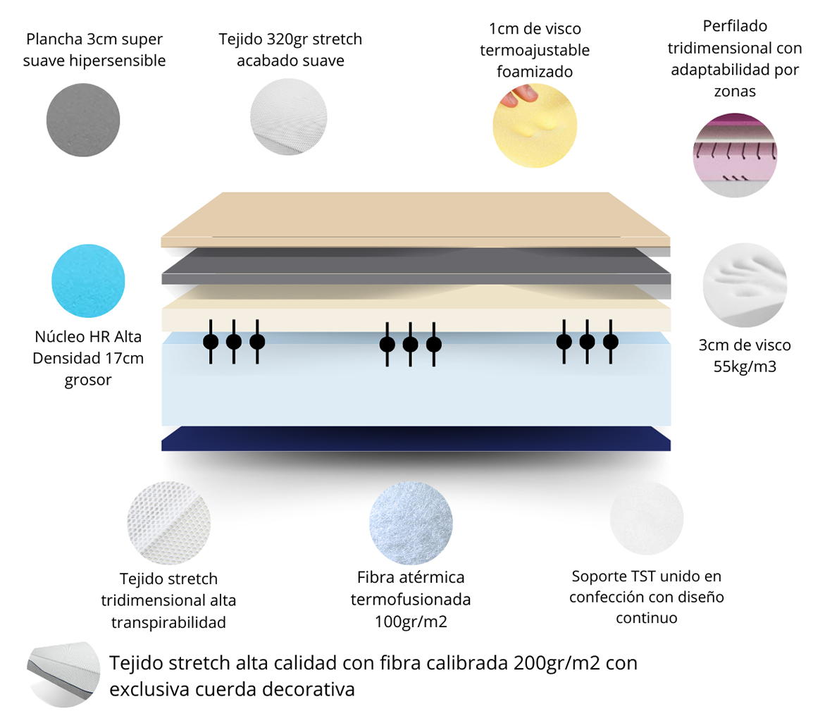 Núcleo | HR alta densidad 17 cm + 3 cm visco 55 kg/m3 perfilado tridimensional con adaptabilidad por zonas + plancha 3 cm súper suave hipersensible
