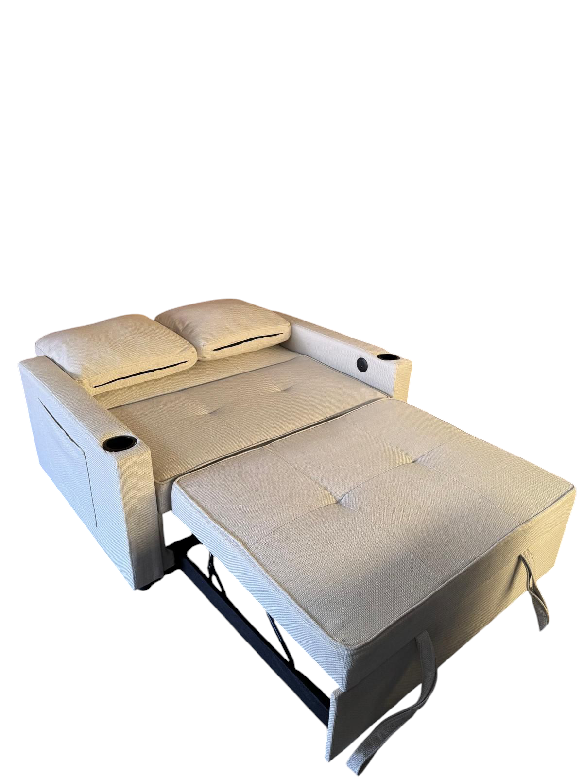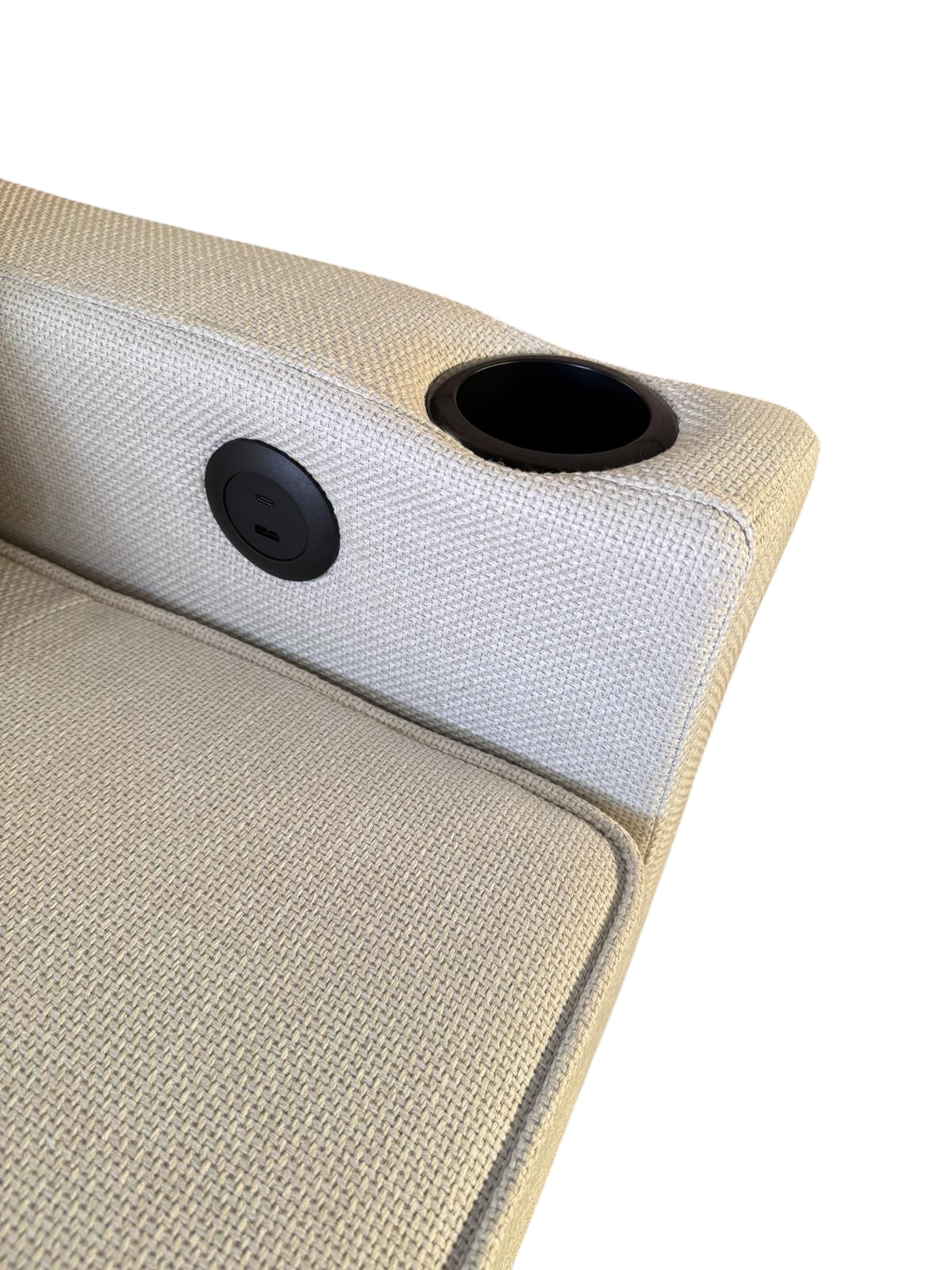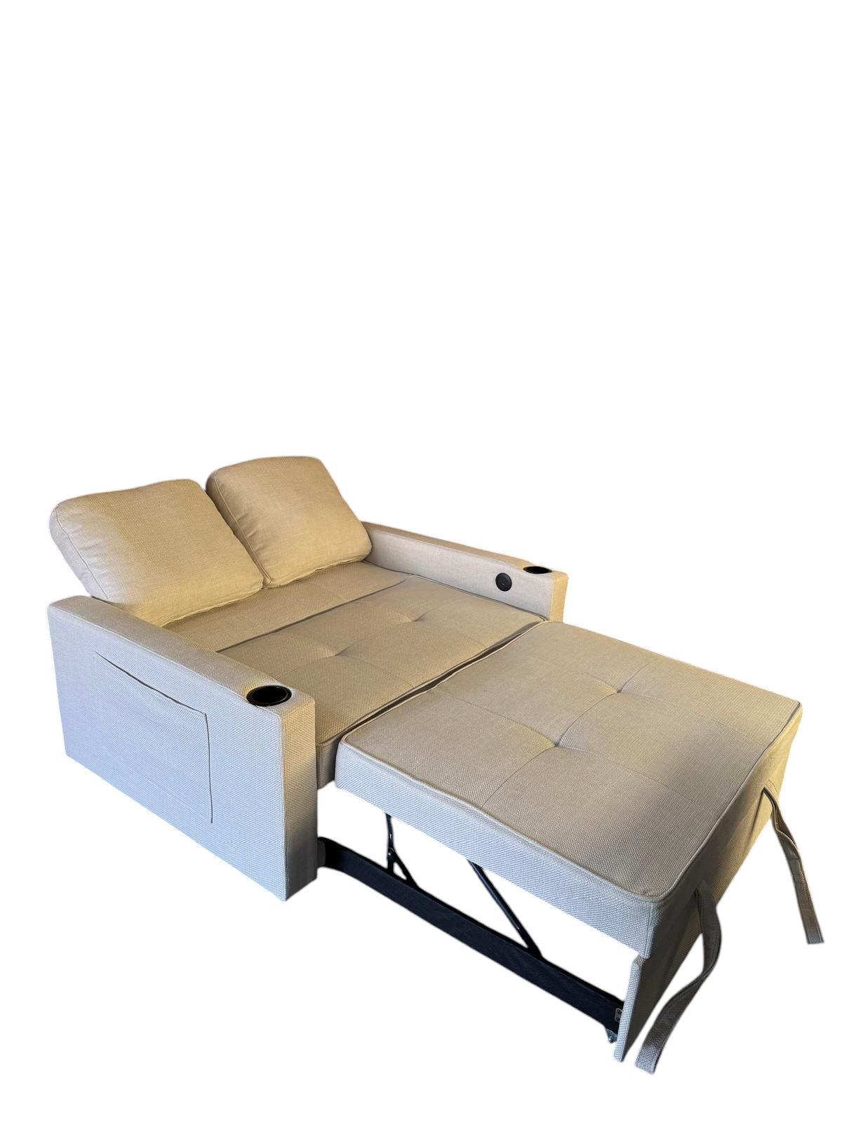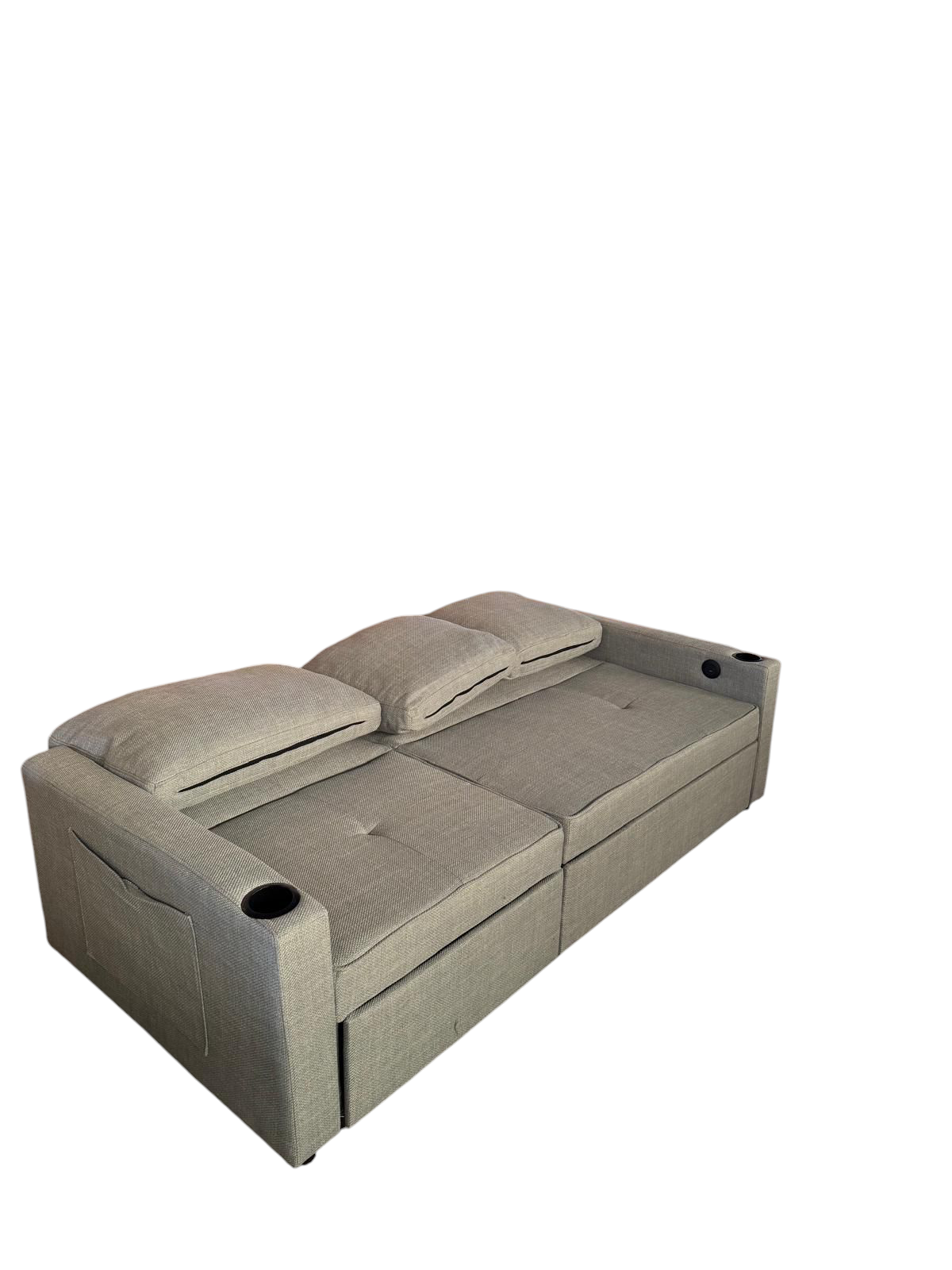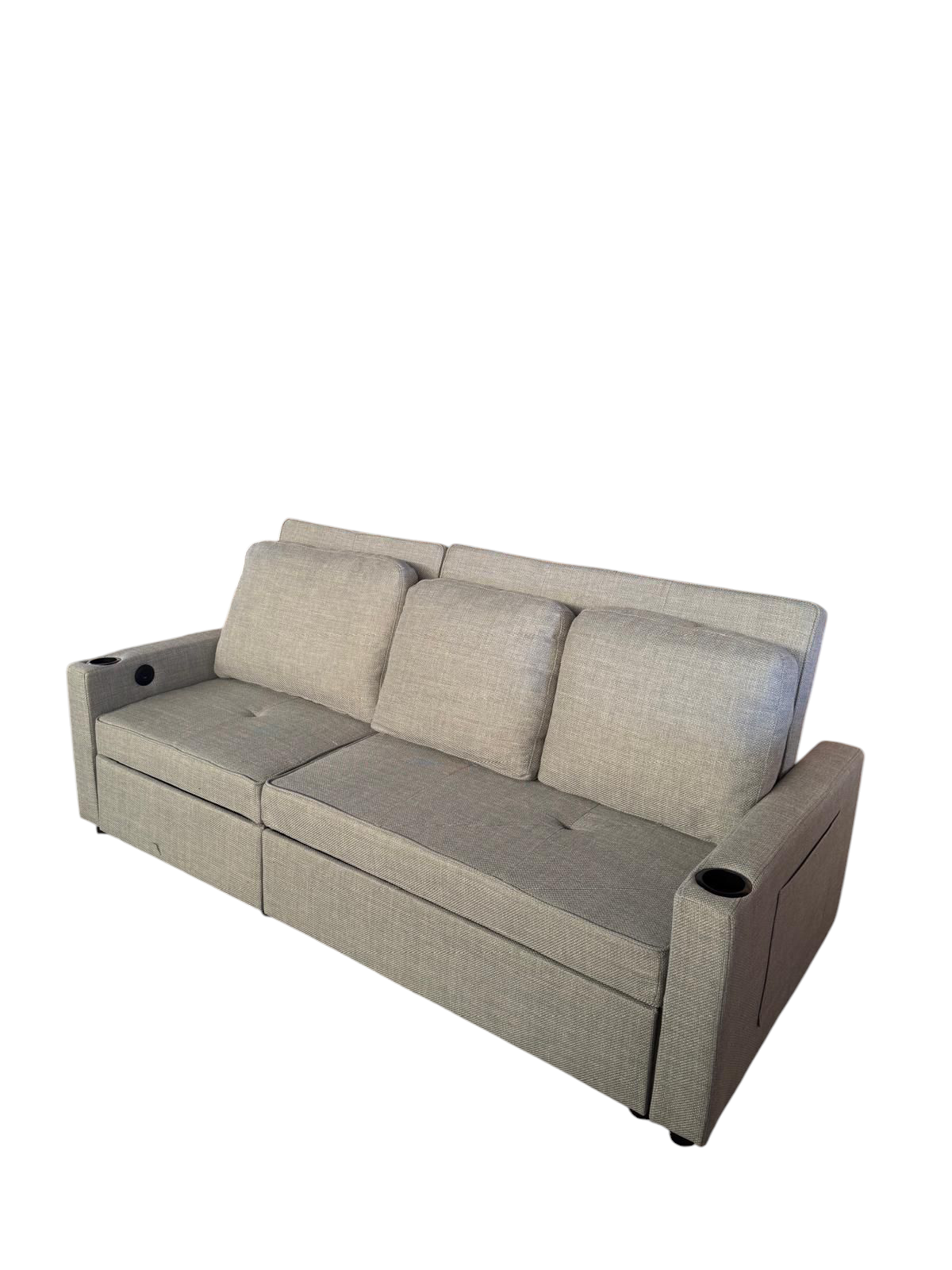 Sofá cama con sistema"Delfin" . Reposabrazos tiene un portavasos y un puerto de USB y type-C.
