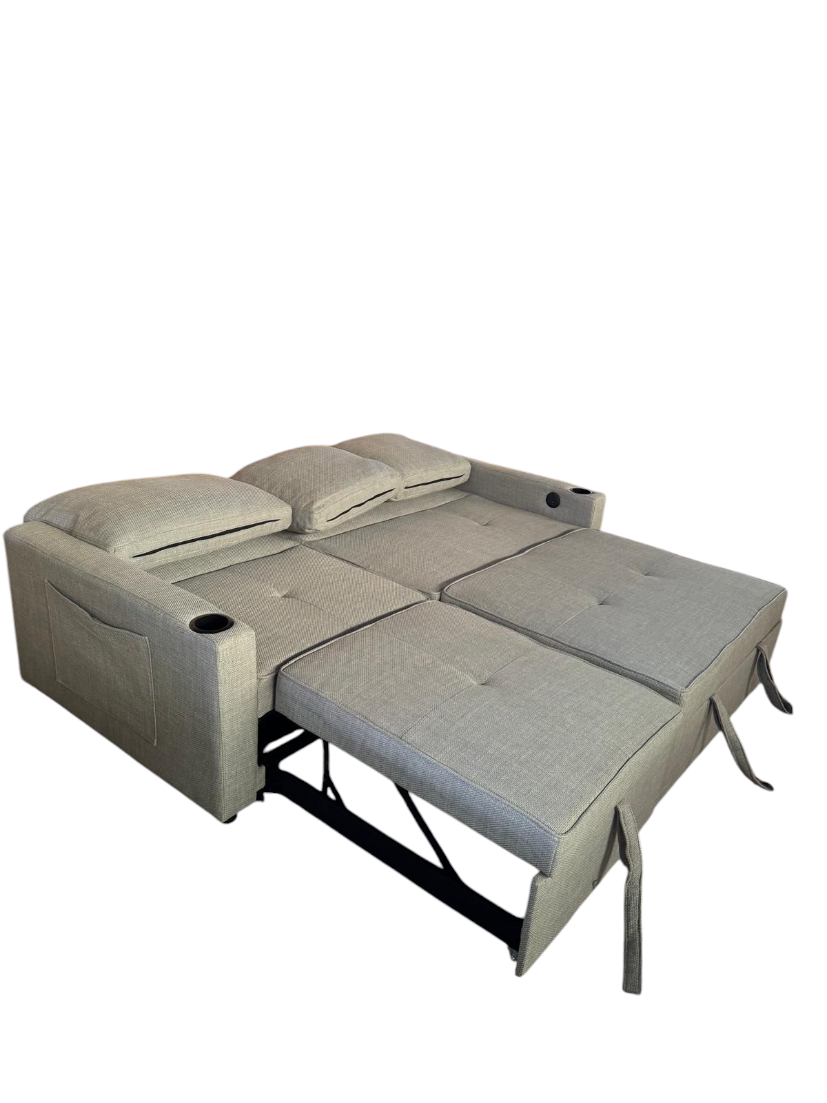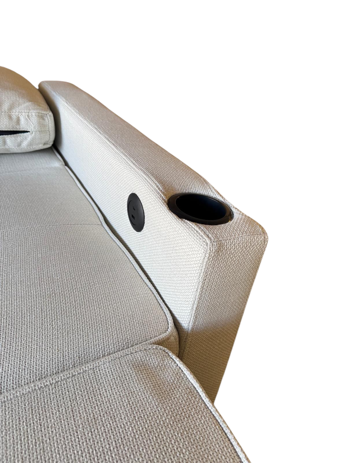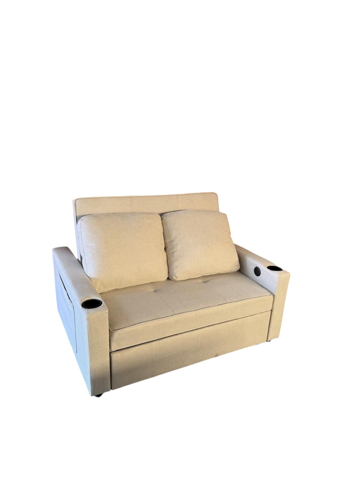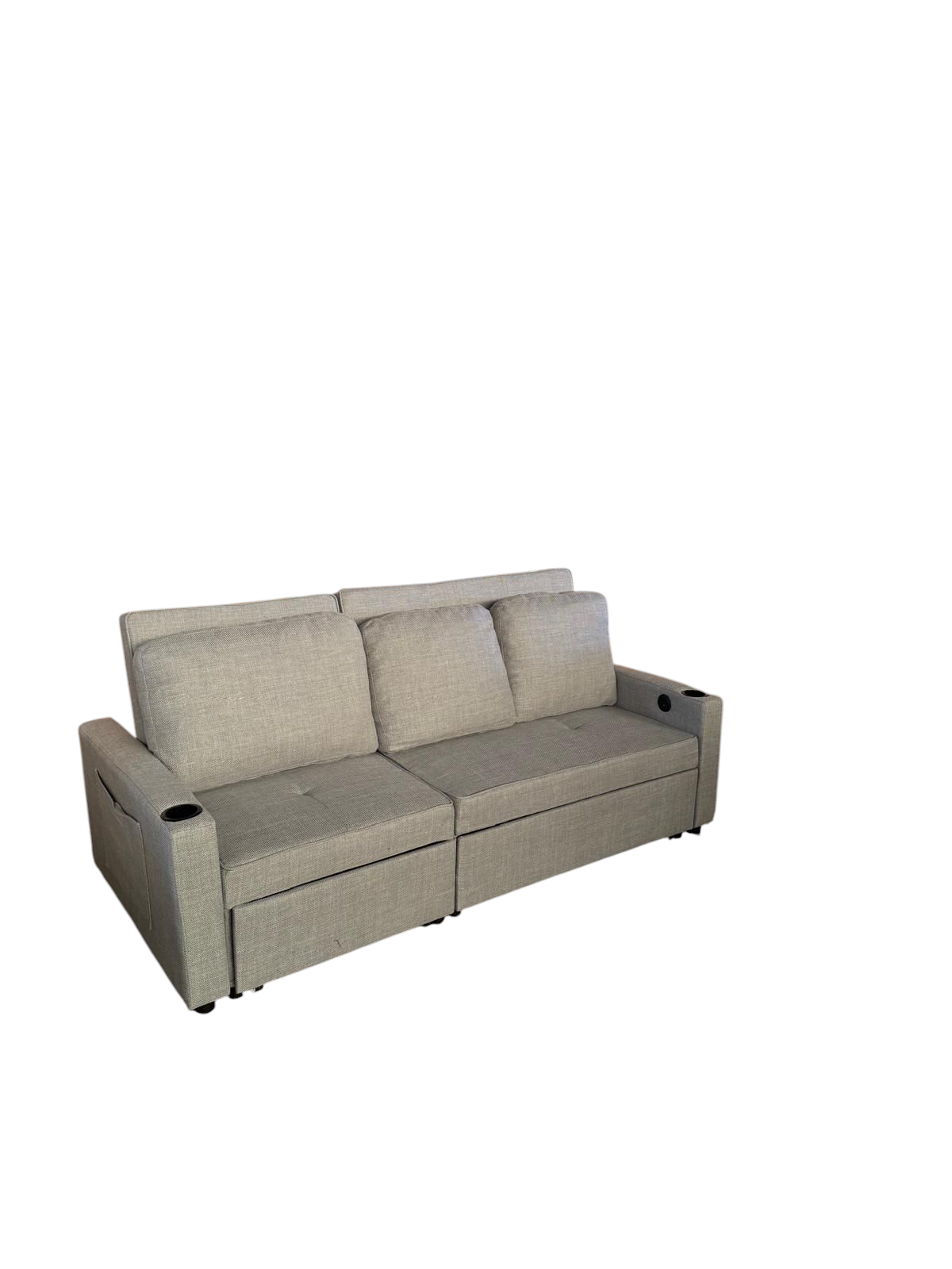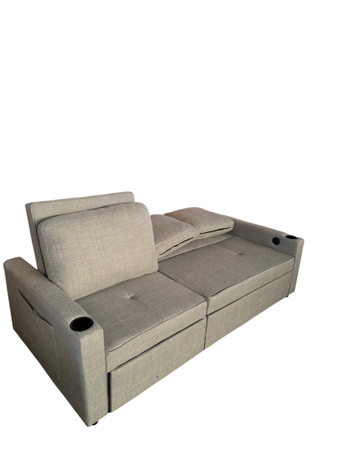Sofá cama con sistema"Delfin" . Reposabrazos tiene un portavasos y un puerto de USB y type-C.