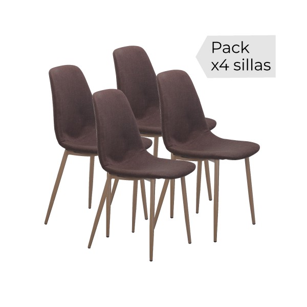 Silla práctica y económica tapizada en tela chocolate y con las patas metálicas pintadas en color madera. Se vende en juegos de 4.