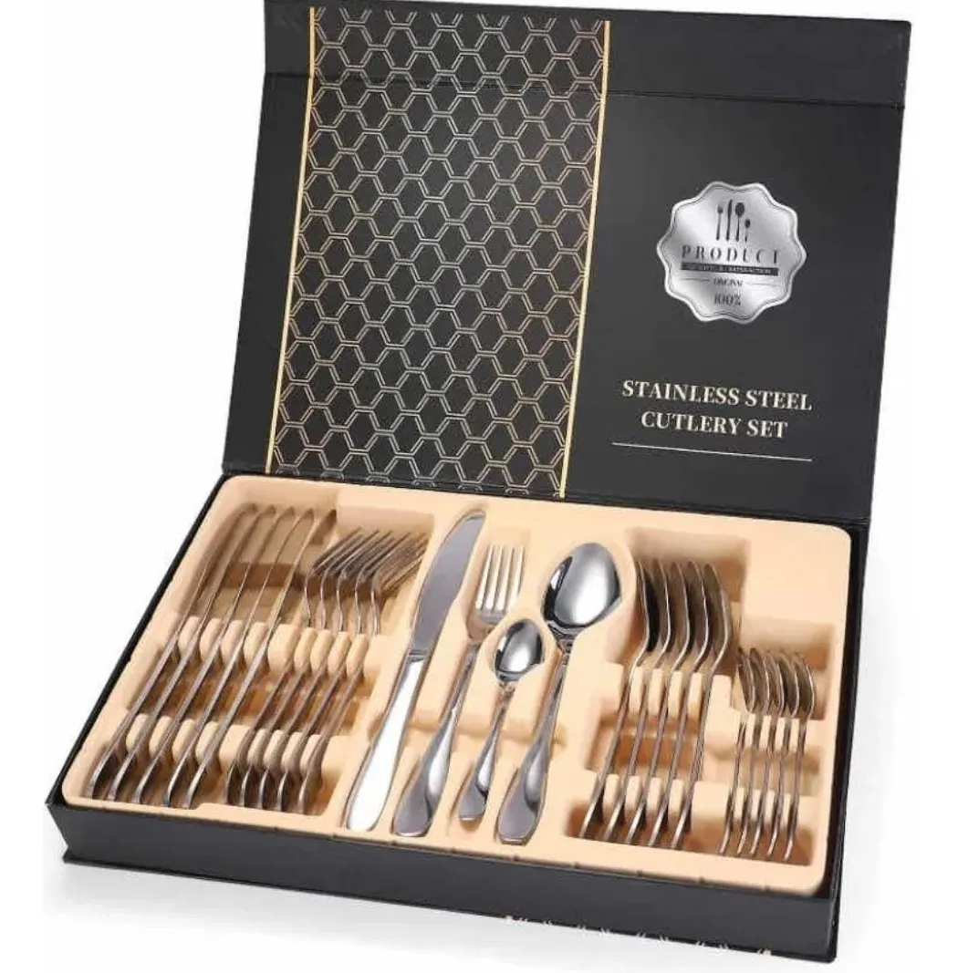 El juego de cubiertos para 6 contiene 6 tenedores de cena, 6 tenedores de ensalada, 6 cucharas de cena, 6 cucharas de té, 6 cuchillos de cena. Este juego de cucharas y tenedores ayudará a tu cena llena de diseño mientras tienes una fiesta.