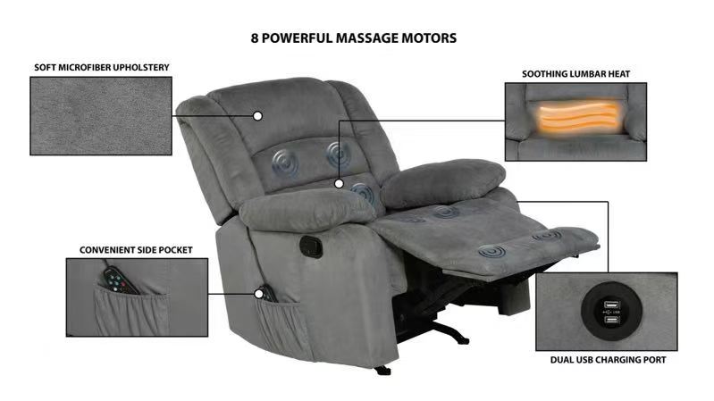 Conveniencia fácil: Di adiós al desorden con almacenamiento oculto. Dos consolas con amplio espacio de almacenamiento y portavasos, ideales para mantener los controles remotos de TV y las revistas perfectamente organizados. Puedes disfrutar charlando con un café durante tu tiempo libre. Los puertos USB en ambos lados del sillón reclinable permiten cargar el dispositivo mientras te relajas en el sofá, eliminando las preocupaciones por cables de carga cortos cuando la batería de tu teléfono se agota. Además, los reposabrazos exteriores del sofá ocultan compartimentos de almacenamiento adicionales para organizar tus pertenencias.