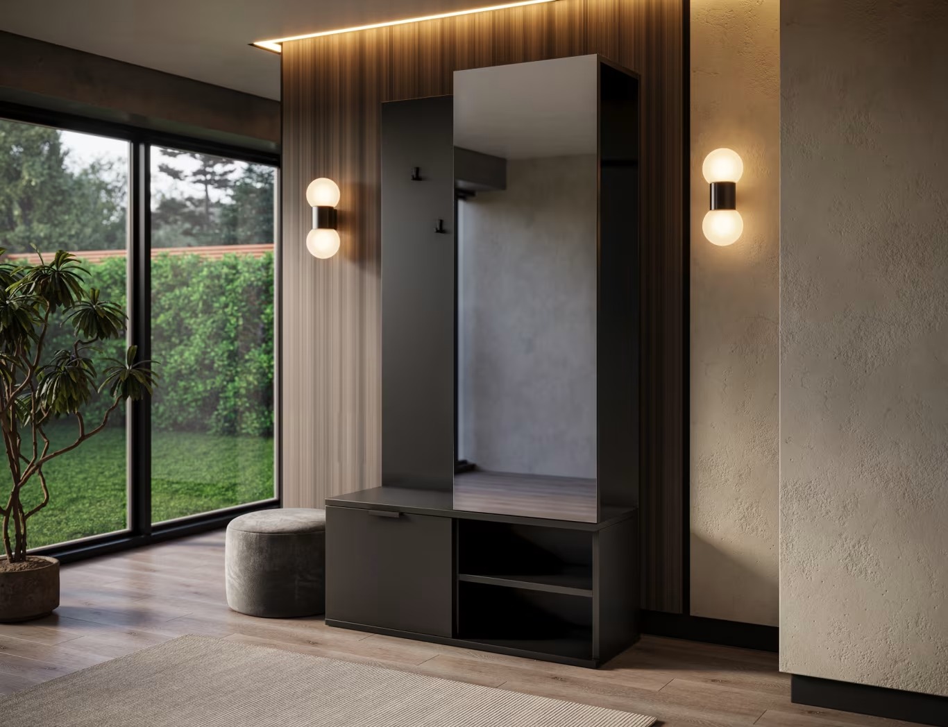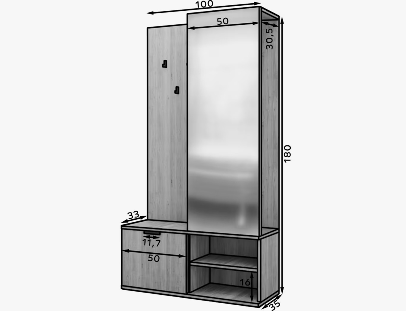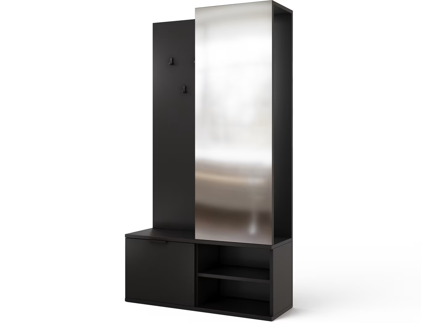 El armario Oturra es un mueble moderno y estilizado que combina perchero, espejo y zapatero en un elegante diseño. Con 100 cm de ancho, 189 cm de alto y 35 cm de fondo, es perfecto para pasillos estrechos, ayudando a mantener la entrada ordenada. La sección superior cuenta con una barra para abrigos y chaquetas, y un soporte metálico para accesorios, mientras que la sección inferior ofrece un práctico armario y dos estantes para zapatos o accesorios. El armario Oturra está fabricado con tablero laminado resistente: los frentes, el cuerpo y las secciones trasera/central son del mismo material, y los cantos están protegidos con un acabado de PVC para mayor resistencia a los daños y facilidad de limpieza. El grosor del cuerpo y los estantes es de 16 mm, y el conjunto pesa 53 kg, lo que garantiza estabilidad y durabilidad durante años. Es la opción perfecta si busca un armario de pasillo funcional con espejo, barra y zapatero de estilo minimalista.