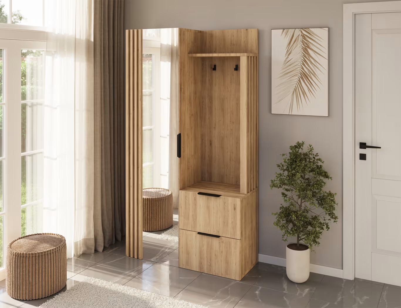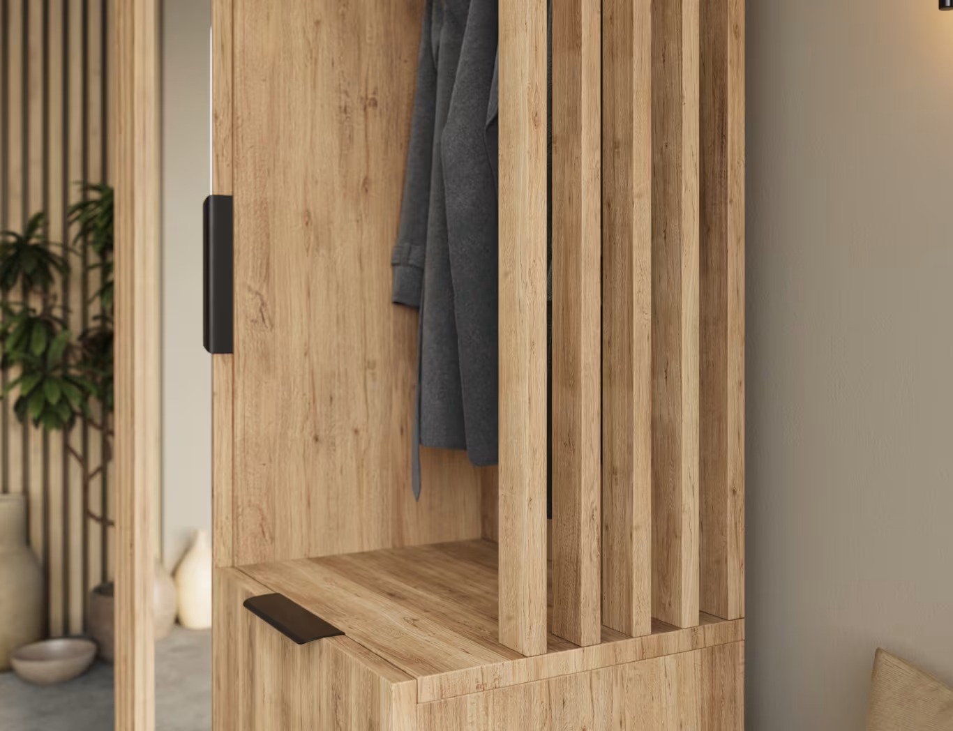 El armario Riganni es un armario de recibidor compacto y excepcionalmente funcional de 100 x 180 x 36 cm, ideal para pasillos estrechos. Combina un armario con espejo, un nicho abierto con ganchos, una barra para colgar ropa y un práctico sistema de almacenamiento para el día a día. Está fabricado en aglomerado macizo de 16 mm de grosor (cuerpo, estantes y frentes) con un resistente acabado de cantos de PVC. La parte trasera y central también son de aglomerado (kapak), lo que garantiza estabilidad y un aspecto elegante. En su interior, cuenta con tres estantes con una capacidad de carga de hasta 20 kg cada uno y dos amplios cajones con una capacidad de carga de hasta 10 kg, ideales para accesorios, zapatos y otros objetos pequeños. Los tiradores metálicos realzan su carácter moderno y su facilidad de uso. Riganni es una excelente opción si busca un armario con espejo, estantes y cajones que le ayude a mantener la entrada organizada.