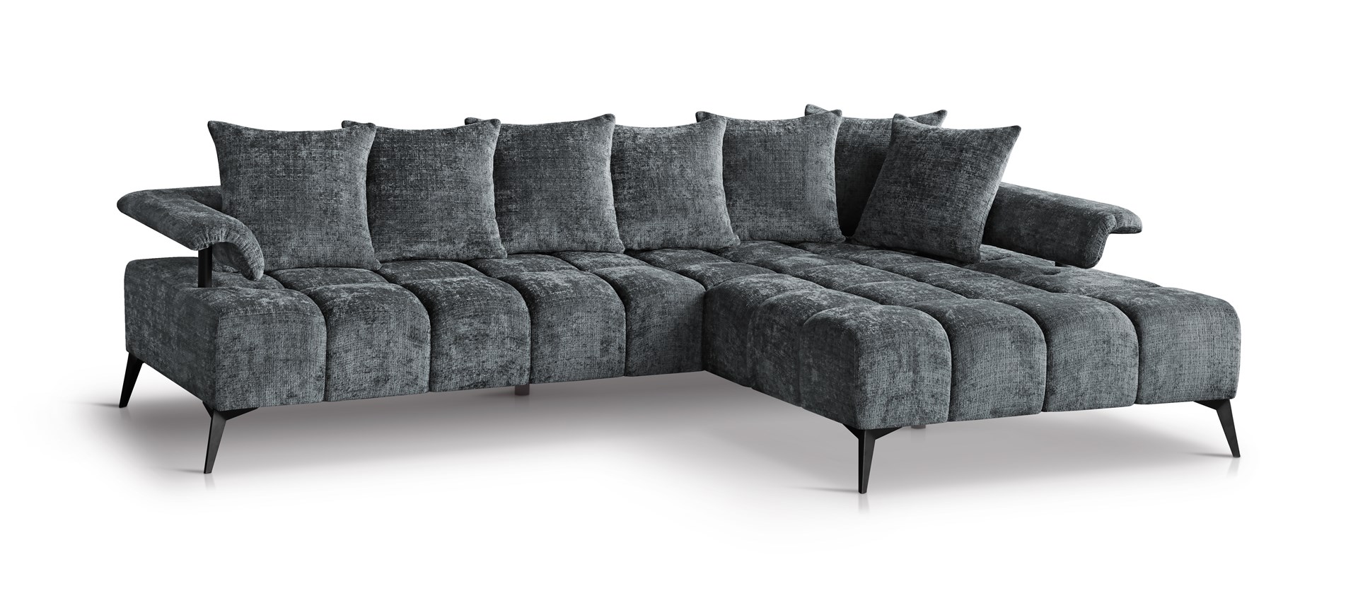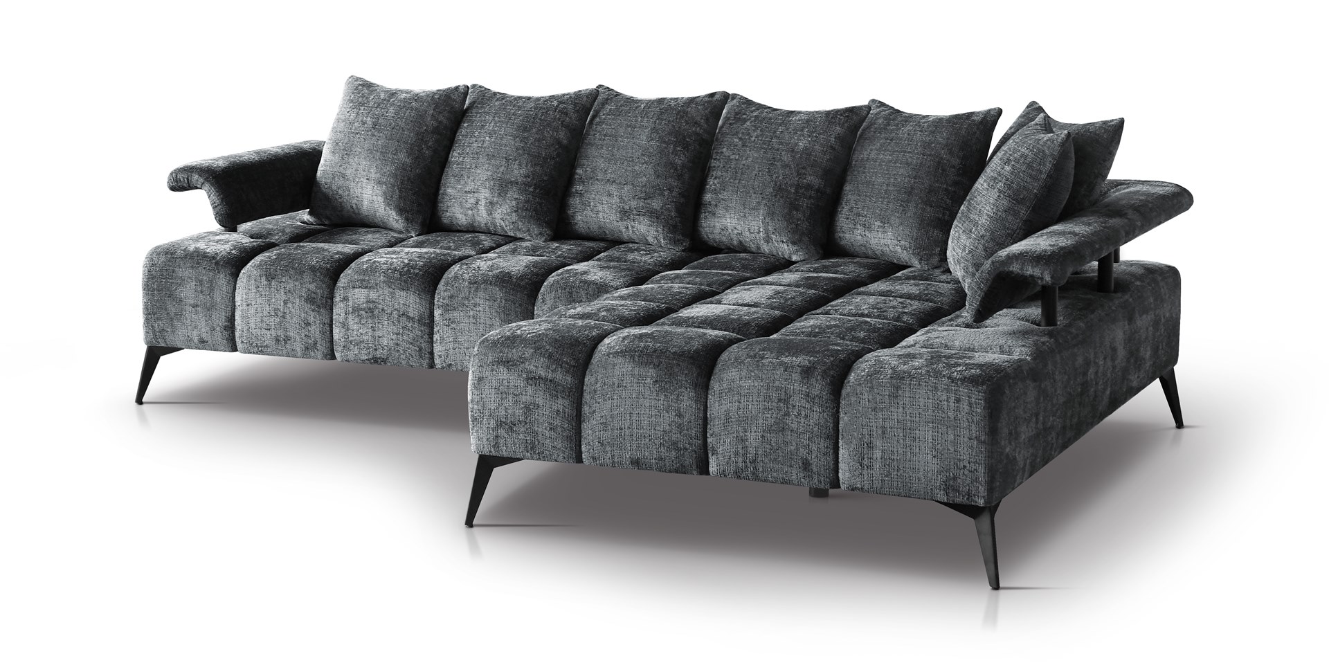 Sofá esquinero sin cama, estructura de muelles en forma de A, costuras decorativas, ribete metálico en el respaldo y patas metálicas negras.