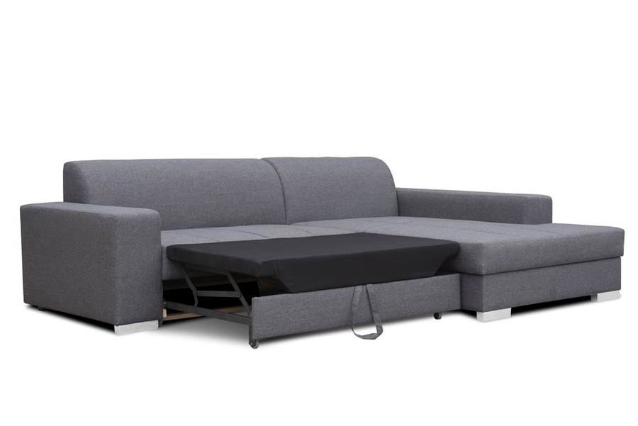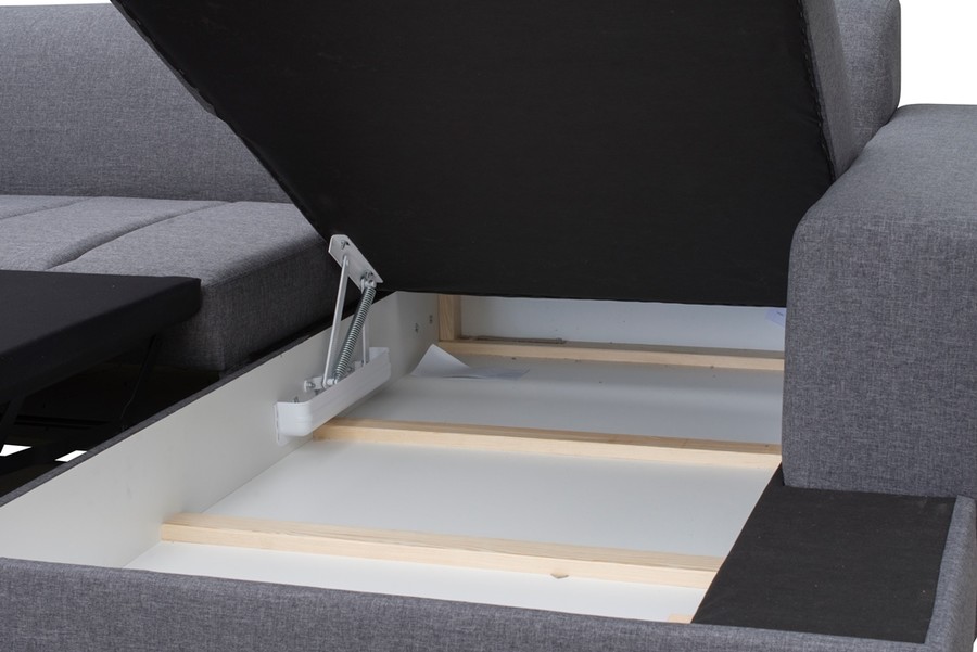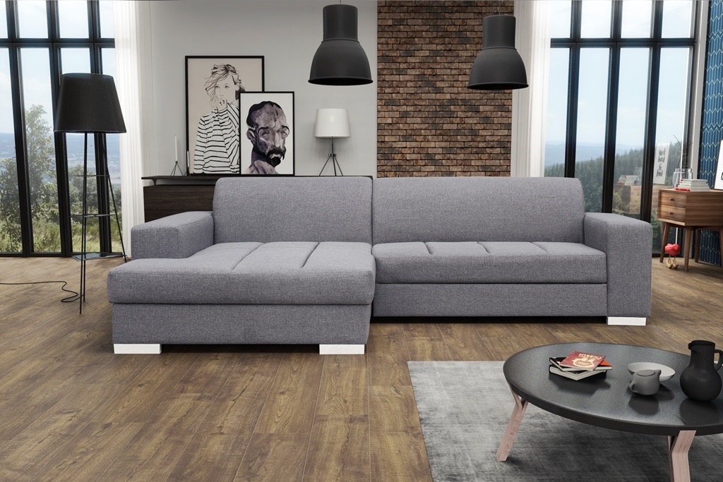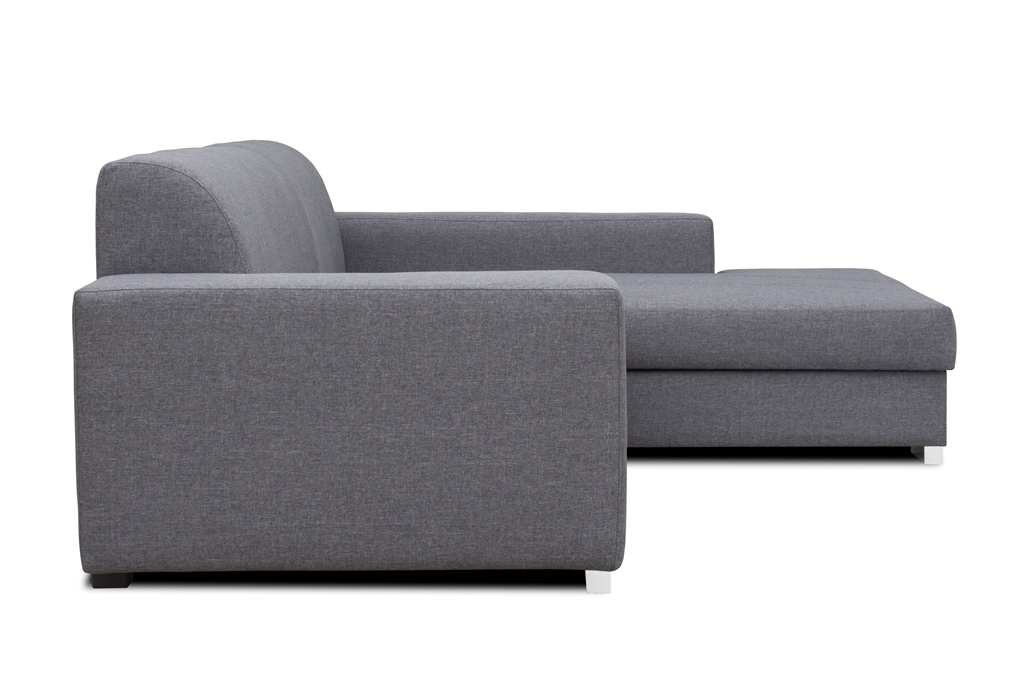 El sofá esquinero MISTRAL es un diseño modernista que encajará perfectamente en salones que se centren en el diseño minimalista y la alta funcionalidad de los muebles. El sofá esquinero de varias plazas en forma de L está disponible en versión derecha e izquierda. La forma bien proporcionada se apoya sobre modernas patas cromadas, que enfatizan el carácter original del mueble. El sofá esquinero con laterales MISTRAL se caracteriza por un respaldo de tamaño mediano con una estructura ligeramente redondeada y perfilada. El sofá esquinero presentado garantiza un asiento cómodo y una siesta por la tarde. El diseño llama la atención con las costuras decorativas visibles en el asiento, que está relleno con muelles ondulados y espuma de tapicería T-30. Los materiales utilizados en el proceso de producción garantizan la adecuada flexibilidad del mueble, lo que evitará que se formen antiestéticas abolladuras. Un sofá esquinero independiente con respaldo tapizado está equipado con un contenedor para ropa de cama y una función para dormir que permite desplegar el sofá esquinero. El moderno modelo MISTRAL está tapizado con tela, la cual está disponible en una amplia gama de colores a elegir.Especificación: