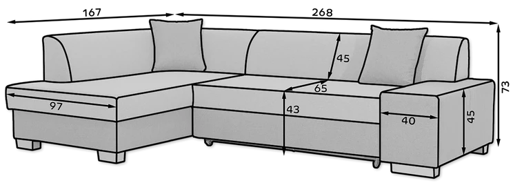 El sofá esquinero Fabio es un mueble multifuncional. Durante el día, sirve como un cómodo sofá y un lugar para relajarse, con sus medidas de 268 x 167 x 73 cm, mientras que por la noche se transforma en una cómoda y espaciosa zona de descanso. El sofá esquinero cuenta con un intuitivo sistema de plegado tipo delfín, que permite un fácil ajuste a la posición de descanso. Una vez desplegado, se transforma en una cama de 195 x 125 cm. El sofá cuenta con un compartimento para ropa de cama ubicado en la otomana, lo que proporciona mayor comodidad. Gracias a su funcionalidad, el sofá esquinero Fabio es ideal tanto como punto focal en un salón, ofreciendo un cómodo espacio para relajarse, como en un estudio, ofreciendo una solución práctica para quienes tienen un apartamento pequeño. Su amplia selección de colores y la posibilidad de combinar tonos facilitan la adaptación del sofá esquinero a sus preferencias y a su diseño interior. Su diseño geométrico le confiere un carácter moderno, ideal para interiores con un estilo moderno, minimalista y neoyorquino.