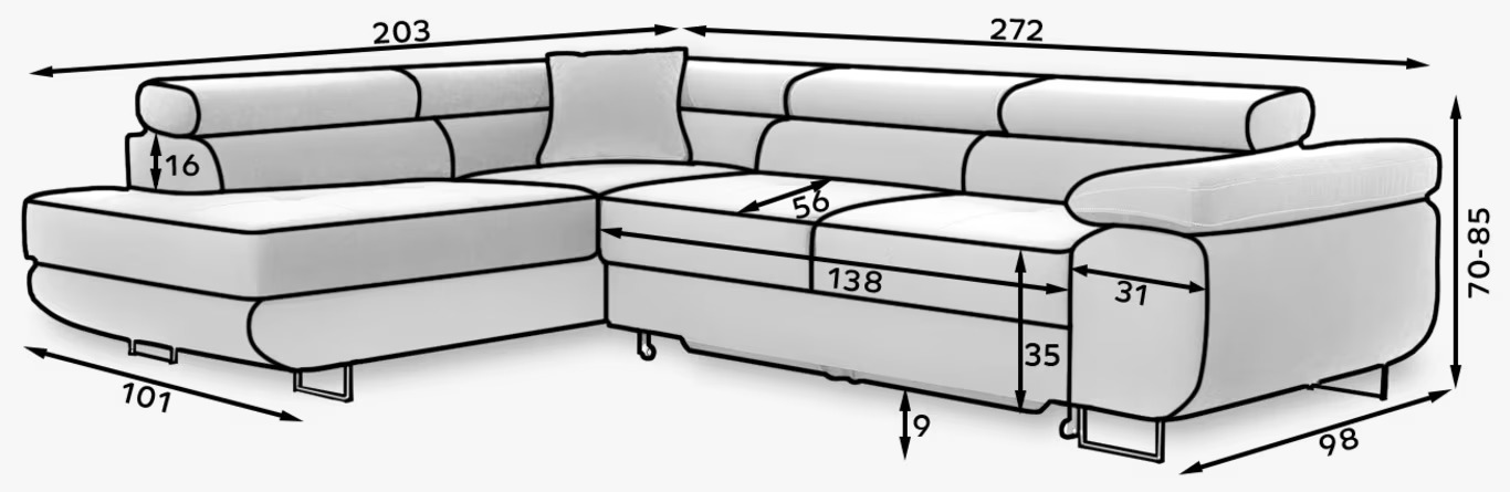 Además de su atractivo diseño, que complementa a la perfección los interiores de estilo moderno y minimalista, el sofá esquinero Anton impresiona por su funcionalidad y calidad de fabricación. Su estructura duradera y estable se combina con un cómodo relleno de asiento hecho de muelles ondulados resistentes al desgaste y espuma T30 excepcionalmente flexible y cómoda. Otras características incluyen un tapizado resistente a la abrasión y a la decoloración, una función de descanso adicional disponible con el sistema de plegado tipo delfín y un espacioso compartimento para ropa de cama ubicado en la otomana del sofá esquinero. Sus dimensiones de 275 x 202 x 85 cm ofrecen un amplio espacio para relajarse durante el día. Desplegado, el modelo Anton ofrece una superficie de descanso de 125 x 193 cm, lo que garantiza un sueño confortable y reparador.