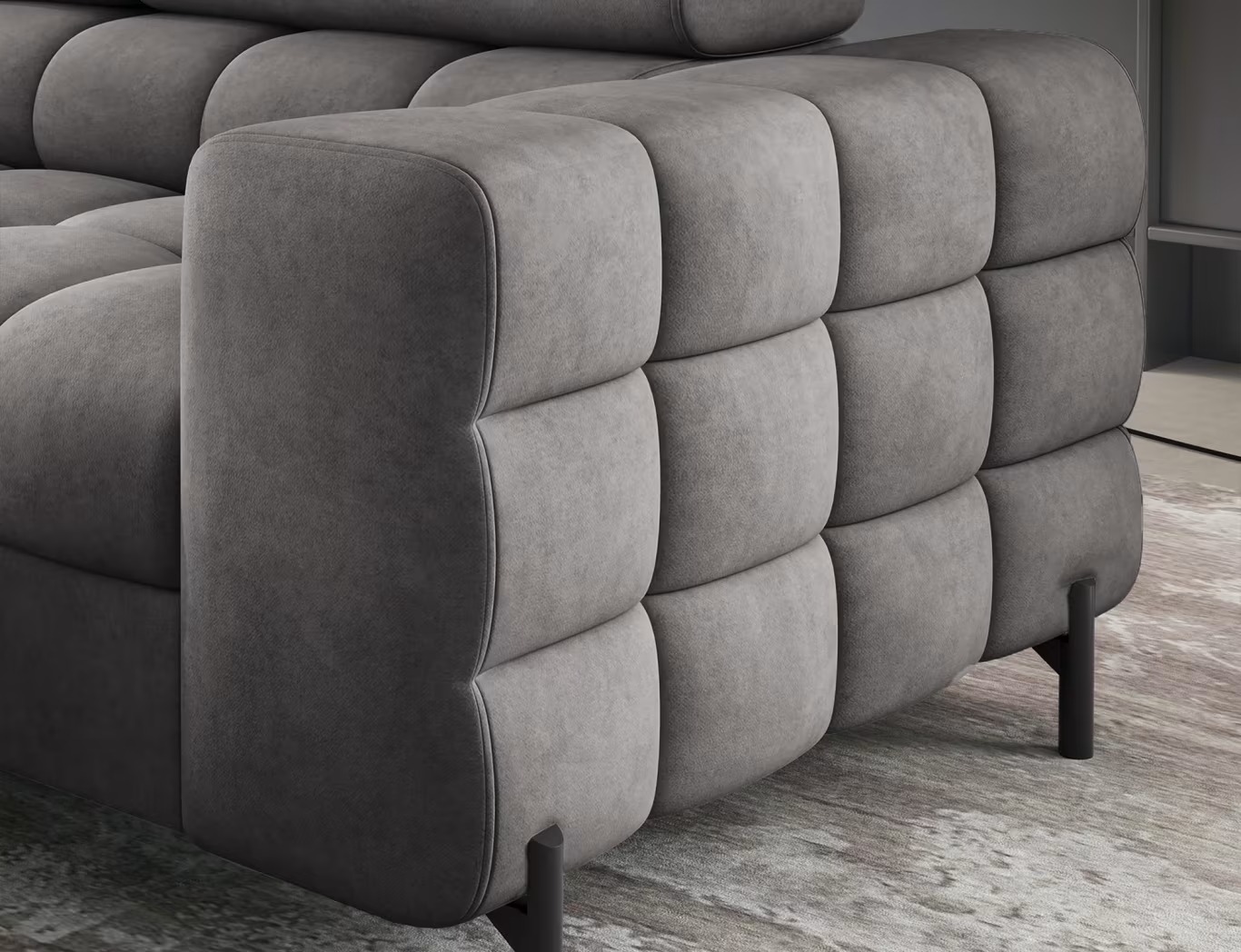 La estructura del sofá se basa en una sólida estructura de madera, mientras que las patas de metal con recubrimiento en polvo, de 9 cm de altura, aportan un toque de ligereza y modernidad. El asiento está relleno de muelles ondulados tipo B y espuma T3030 + HR3030, lo que garantiza la comodidad del asiento. El respaldo, fabricado en espuma de poliuretano T2130, proporciona un soporte lumbar óptimo.