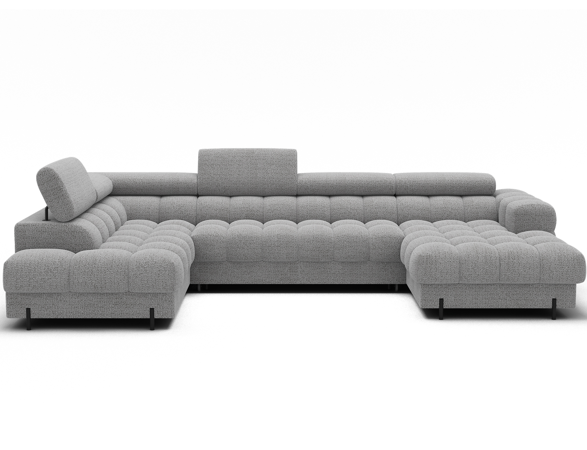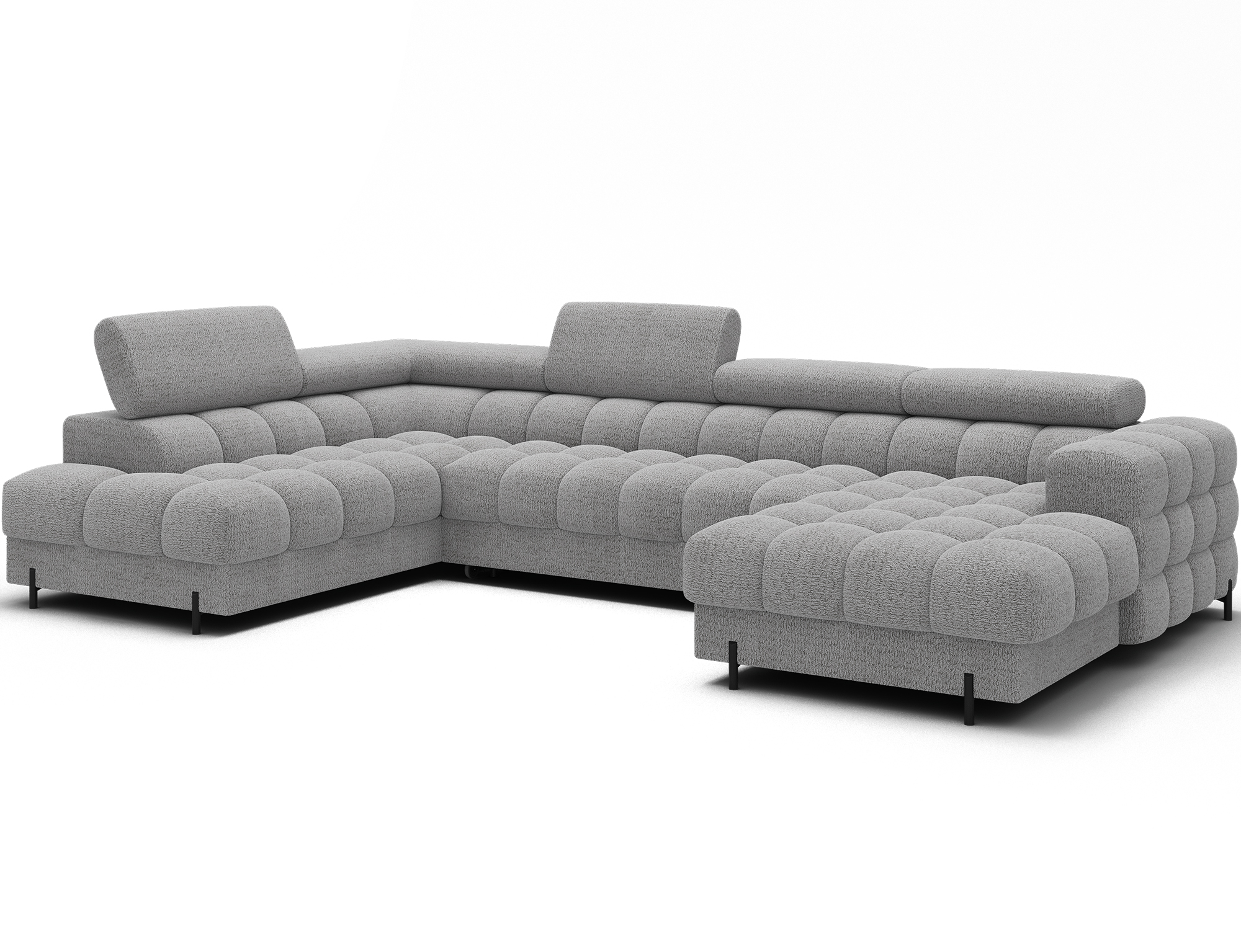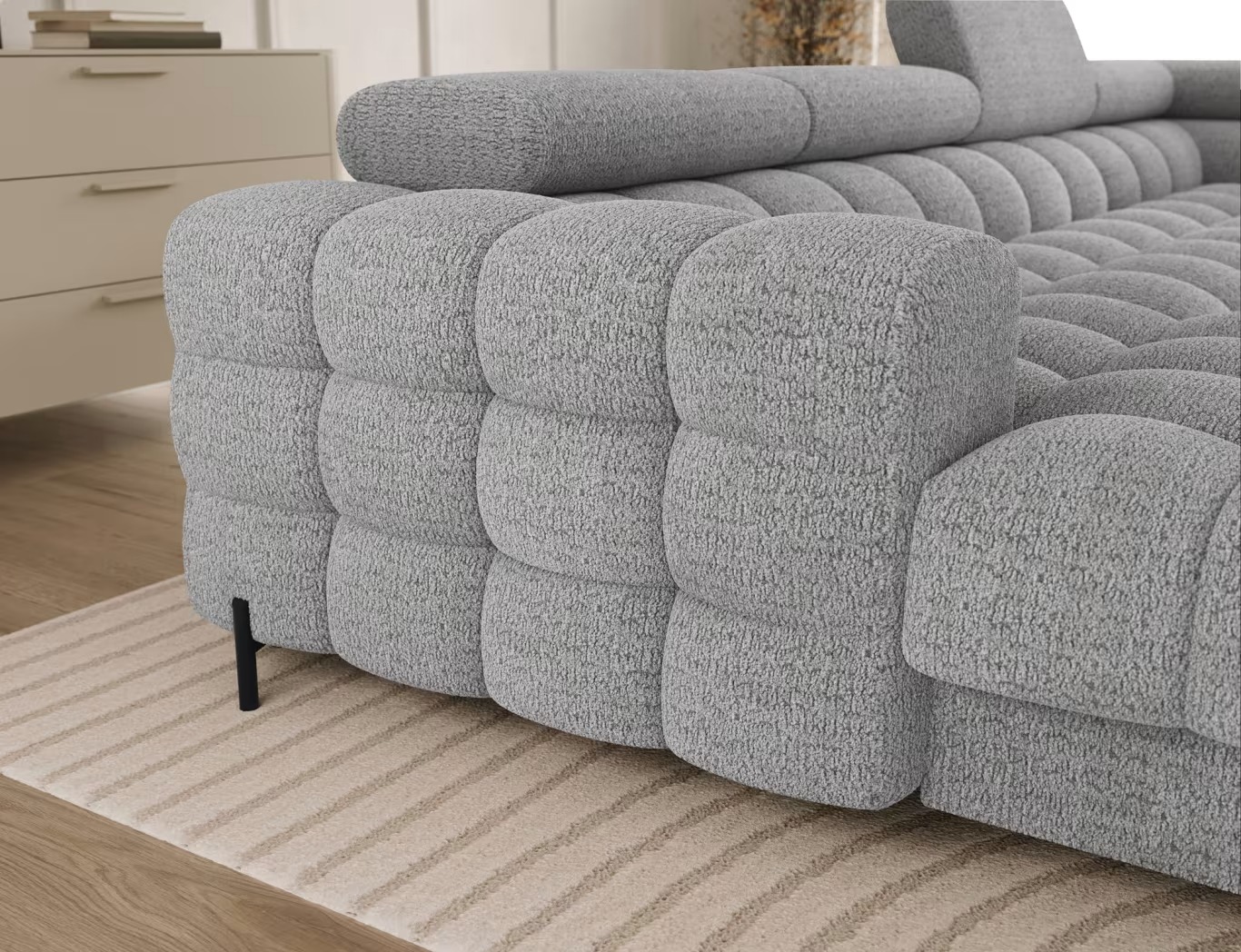 El sofá esquinero Feraria, con sus impresionantes dimensiones de 358 x 202 x 93 cm, es un mueble de salón moderno y funcional, diseñado para espacios amplios y elegantes. Gracias al uso de un muelle ondulado tipo B y dos tipos de espuma (T3030 y HR3030 contorneada), proporciona un alto confort tanto al sentarse como al dormir. Equipado con una práctica función de descanso, se transforma rápidamente en una cómoda cama, mientras que el espacioso compartimento para la ropa de cama ofrece espacio de almacenamiento adicional. El respaldo tapizado permite colocarlo fácilmente en cualquier lugar del salón sin tener que apoyarlo contra la pared, lo que proporciona una gran flexibilidad de diseño. Todo el conjunto reposa sobre patas de metal macizo negro con recubrimiento en polvo que realzan el carácter moderno del sofá esquinero y le aportan un toque de ligereza visual. Feraria es la combinación perfecta de estilo, comodidad y practicidad para quienes valoran la calidad, el diseño y la funcionalidad en un solo mueble.