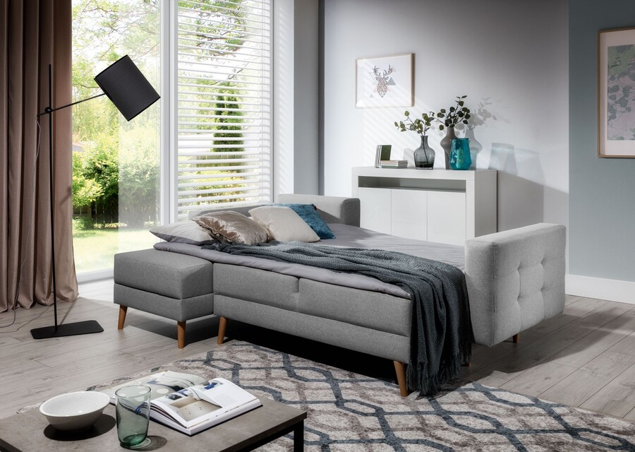 El modelo Asgard L es sin duda un mueble funcional. Sus dimensiones te permiten relajarte libremente durante el día. Una función adicional para dormir, respaldada por el sistema de despliegue automático DL, te ayuda a adaptar fácilmente el sofá esquinero al descanso nocturno y, gracias al amplio espacio para guardar la ropa de cama, te permite mantener todo ordenado. La calidad de los muebles también se ve influenciada por la forma del relleno del asiento: la combinación de muelle ondulado y espuma T30 garantiza un soporte adecuado del cuerpo durante el descanso y un alivio de la columna. Para mejorar el confort durante su uso, el mueble, además de estar equipado con respaldos debidamente perfilados, dispone de un rodillo tapizado adicional sujeto con velcro. Gracias a ello, el usuario puede decidir en parte el grado de inclinación del respaldo.