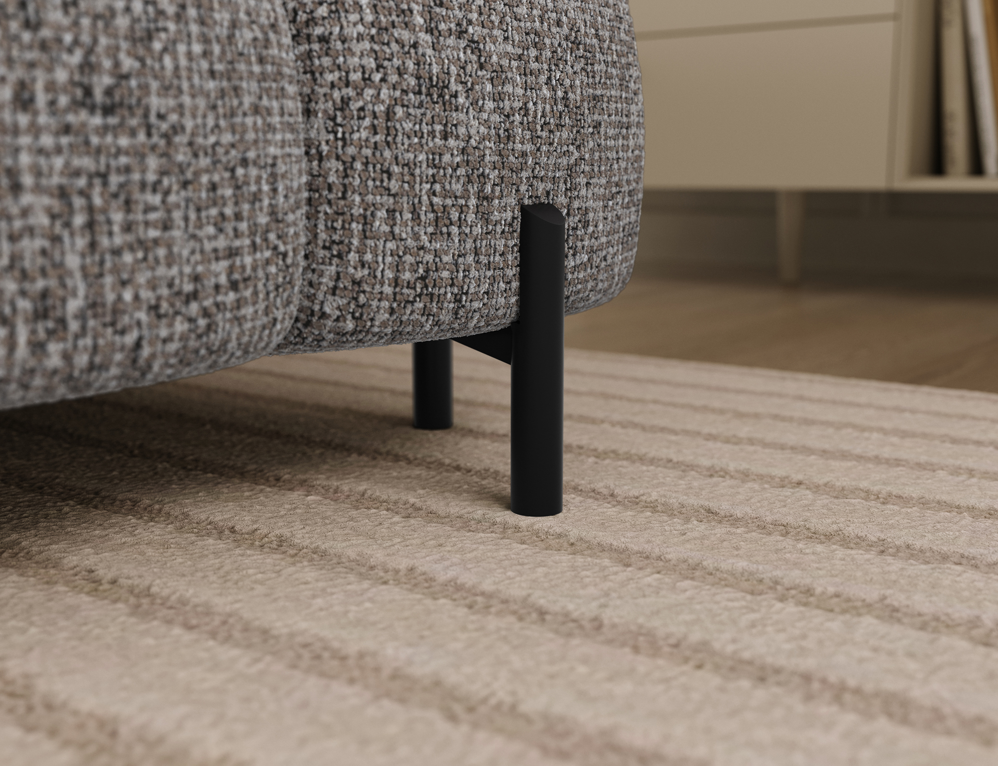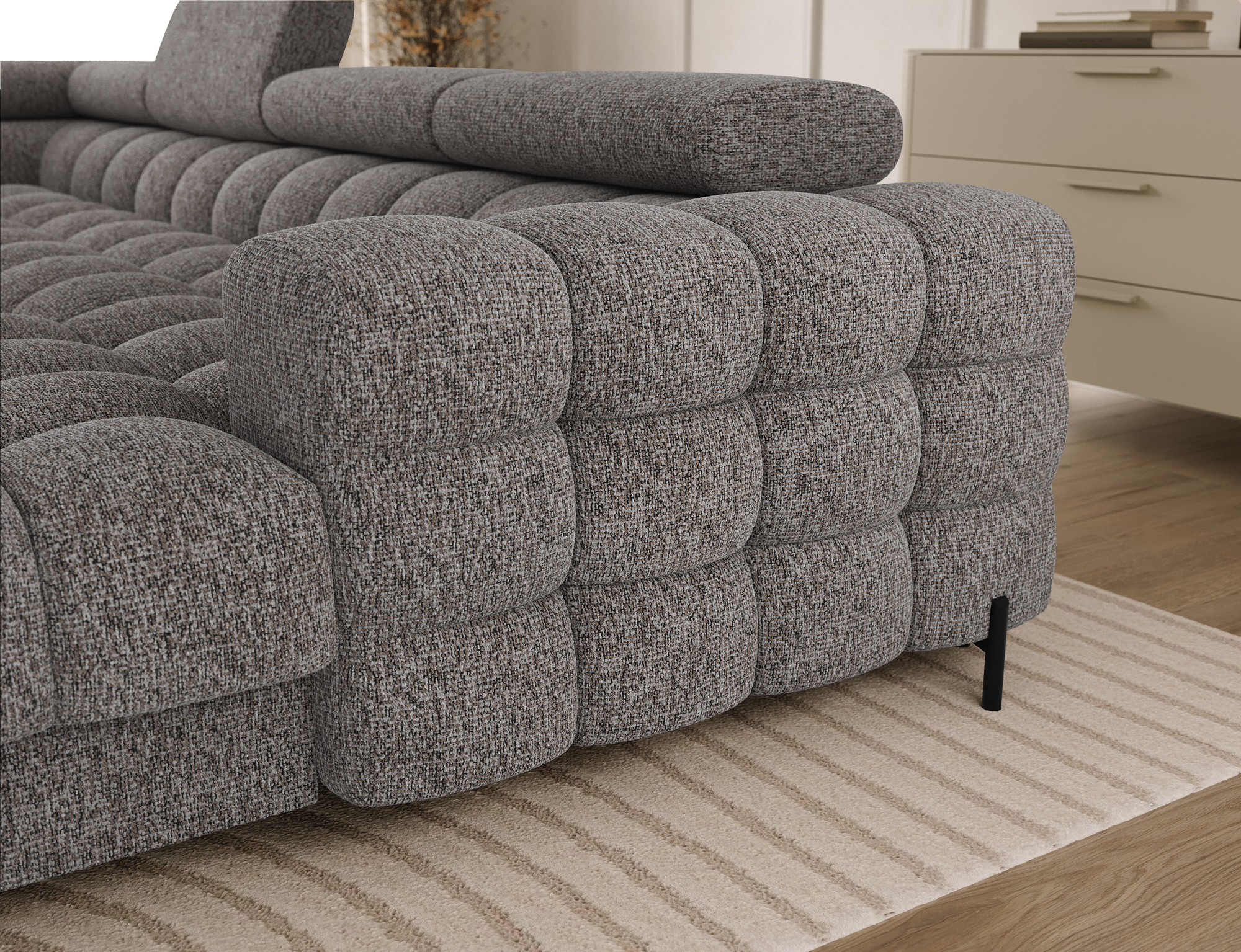 El sofá esquinero Feraria, con sus impresionantes dimensiones de 358 x 202 x 93 cm, es un mueble de salón moderno y funcional, diseñado para espacios amplios y elegantes. Gracias al uso de un muelle ondulado tipo B y dos tipos de espuma (T3030 y HR3030 contorneada), proporciona un alto confort tanto al sentarse como al dormir. Equipado con una práctica función de descanso, se transforma rápidamente en una cómoda cama, mientras que el espacioso compartimento para la ropa de cama ofrece espacio de almacenamiento adicional. El respaldo tapizado permite colocarlo fácilmente en cualquier lugar del salón sin tener que apoyarlo contra la pared, lo que proporciona una gran flexibilidad de diseño. Todo el conjunto reposa sobre patas de metal macizo negro con recubrimiento en polvo que realzan el carácter moderno del sofá esquinero y le aportan un toque de ligereza visual. Feraria es la combinación perfecta de estilo, comodidad y practicidad para quienes valoran la calidad, el diseño y la funcionalidad en un solo mueble.