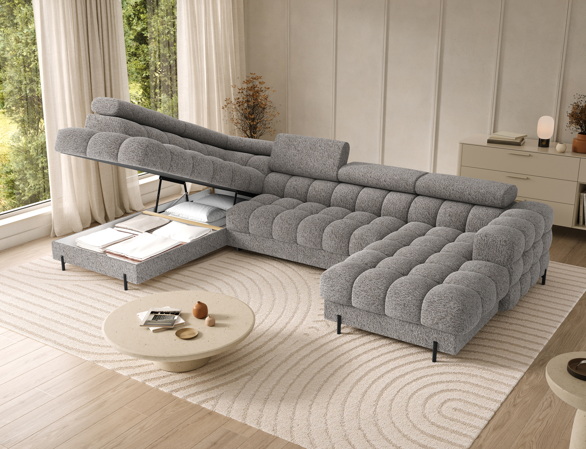 sofá cama, forma de U, cabezales reclinables, arcón de almasenaje, sofá u, patas altas, sofá grande, sofá diseño moderno, sofá elegante, sofás para salón, sofás salón comedor |
