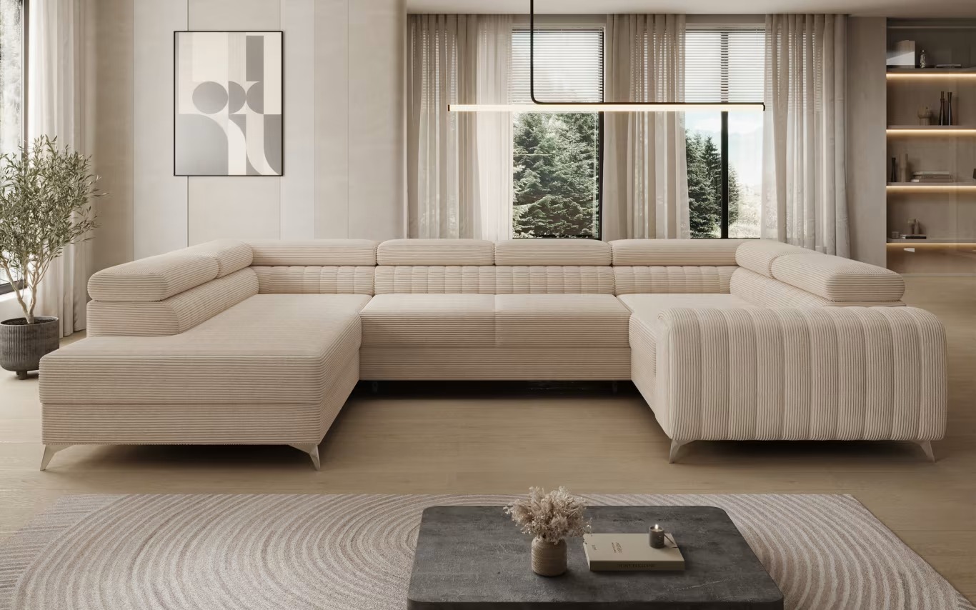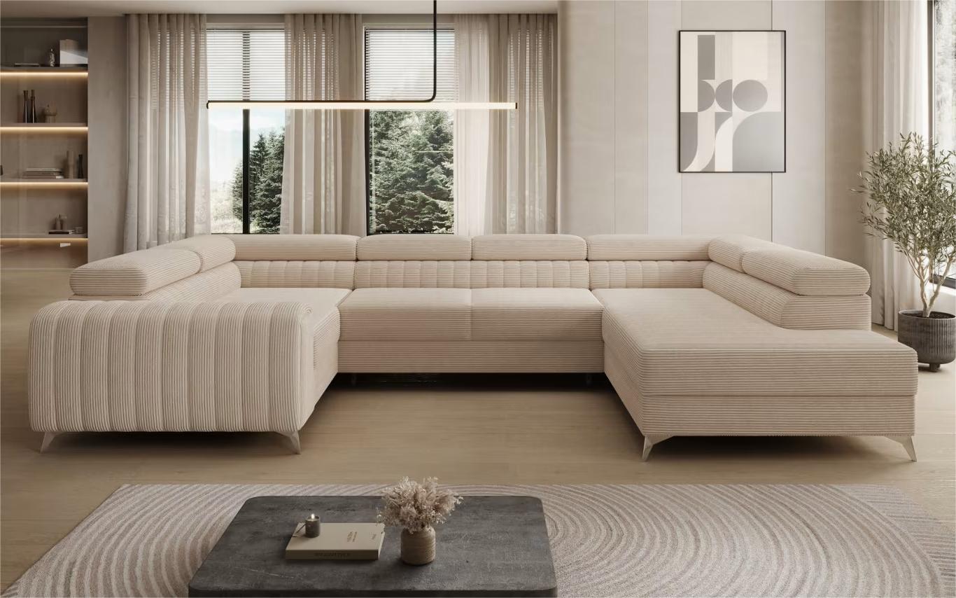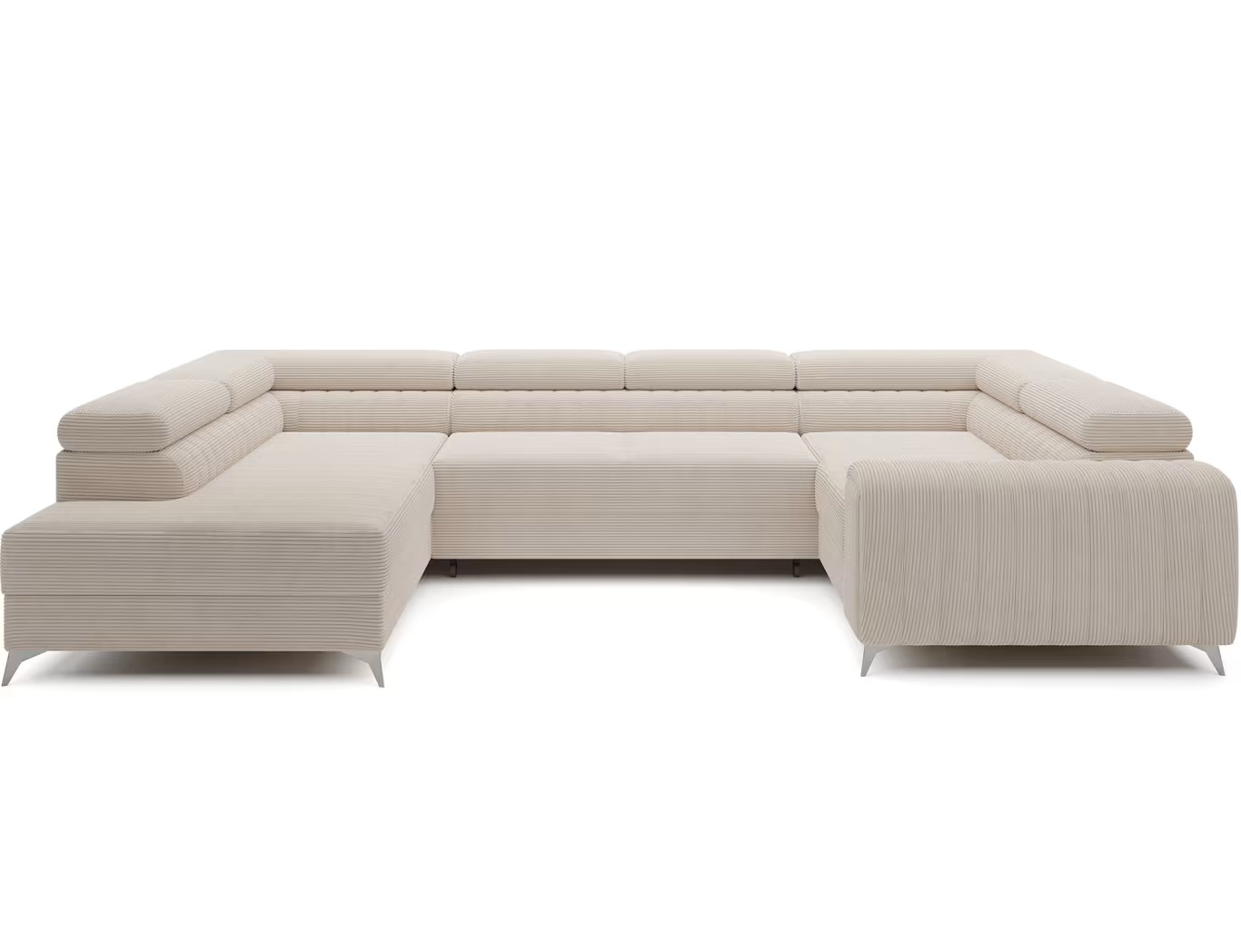 SOFÁ GRANDE CON CAMA Y ARCÓN FORMA DE U CON PATAS ALTAS 347 CM X 202 CM LUIS BEIGE/TELA PANA