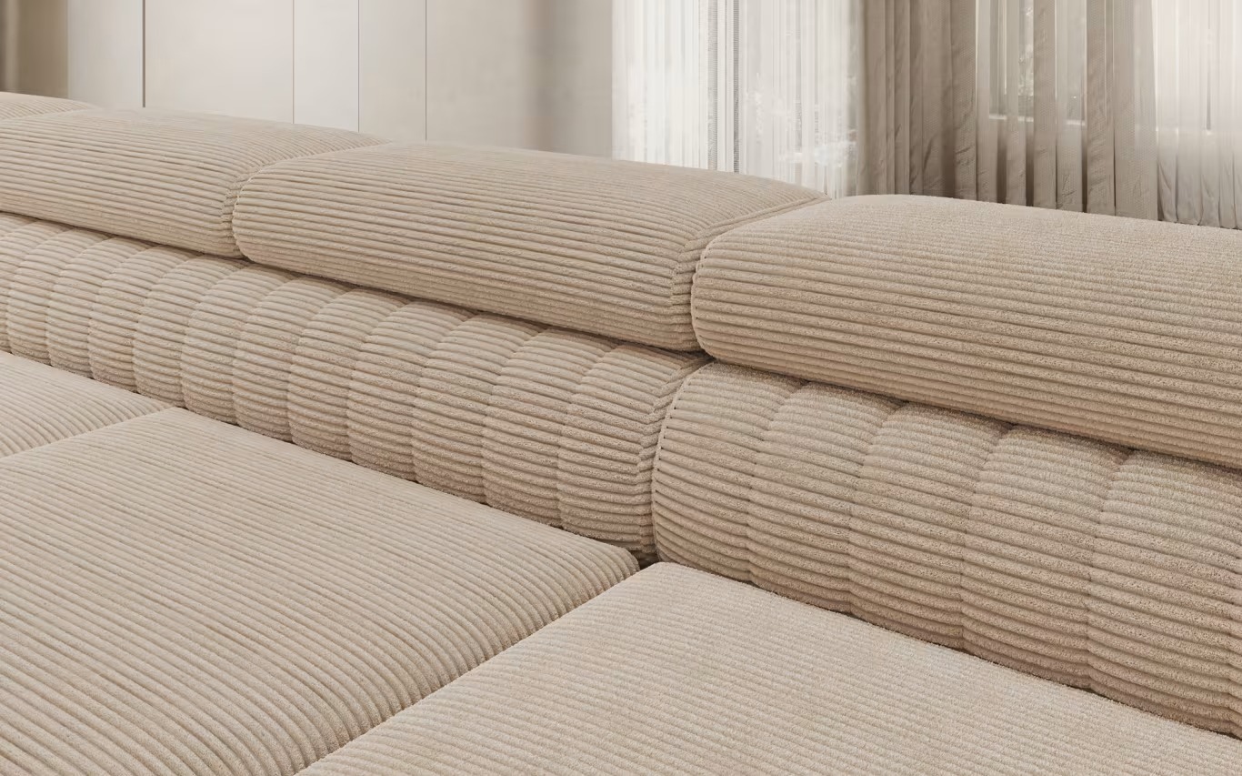 Diseñado pensando en la relajación, este mueble es suave y acogedor, lo que lo convierte en el lugar perfecto para relajarse. Esto se consigue rellenando los asientos con espuma T30 y HR, que se adapta perfectamente al cuerpo y aumenta la sensación de confort. Las dimensiones del sofá esquinero Louis: 340 x 202 x 92 cm, aumentan el nivel de confort. Un reposabrazos robusto y acolchado proporciona una relajación adicional para los hombros. Otra característica clave de este sofá esquinero son sus cuatro reposacabezas ajustables, que ofrecen un cómodo lugar para descansar la cabeza. Complementa la decoración de tu hogar con este acogedor sofá esquinero y no tendrás que preocuparte por dónde guardar ropa de cama, mantas o almohadas adicionales. Louis cuenta con un compartimento para ropa de cama, lo que te permite ocultar objetos que no deben pasar desapercibidos en el salón. Además, Louis es la solución perfecta cuando necesitas espacio adicional. La amplia zona de descanso de 210 x 125 cm permite un sueño reparador y una regeneración saludable. Además, el mecanismo de reclinación tipo delfín es sencillo e intuitivo.