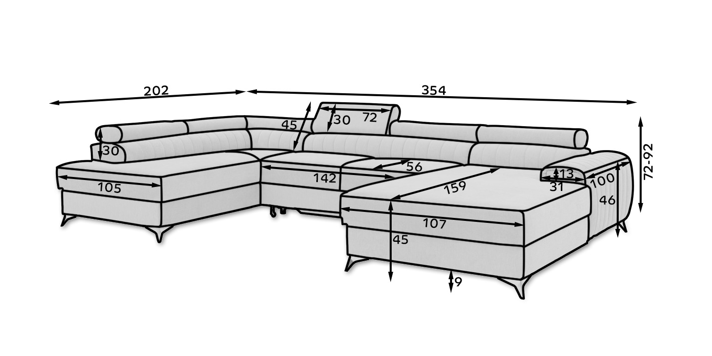Utilice nuestro sofá esquinero en forma de U para reunirse alrededor de la mesa de centro para jugar a un juego de mesa, echarse una siesta o disfrutar de una maratón de películas. El asiento, fabricado con muelles sinuosos y una combinación de espuma HR de alta resiliencia y espuma T30, sin duda le proporcionará un descanso confortable. Y no olvidemos los modernos reposacabezas ajustables. Gracias a ellos, podrá relajarse cómodamente y charlar tranquilamente, leer un libro o ver la televisión. El sofá esquinero Lacante se adaptará a la perfección a cualquier hogar, tanto tradicional como moderno. Nada más, nada menos, simplemente relájese.