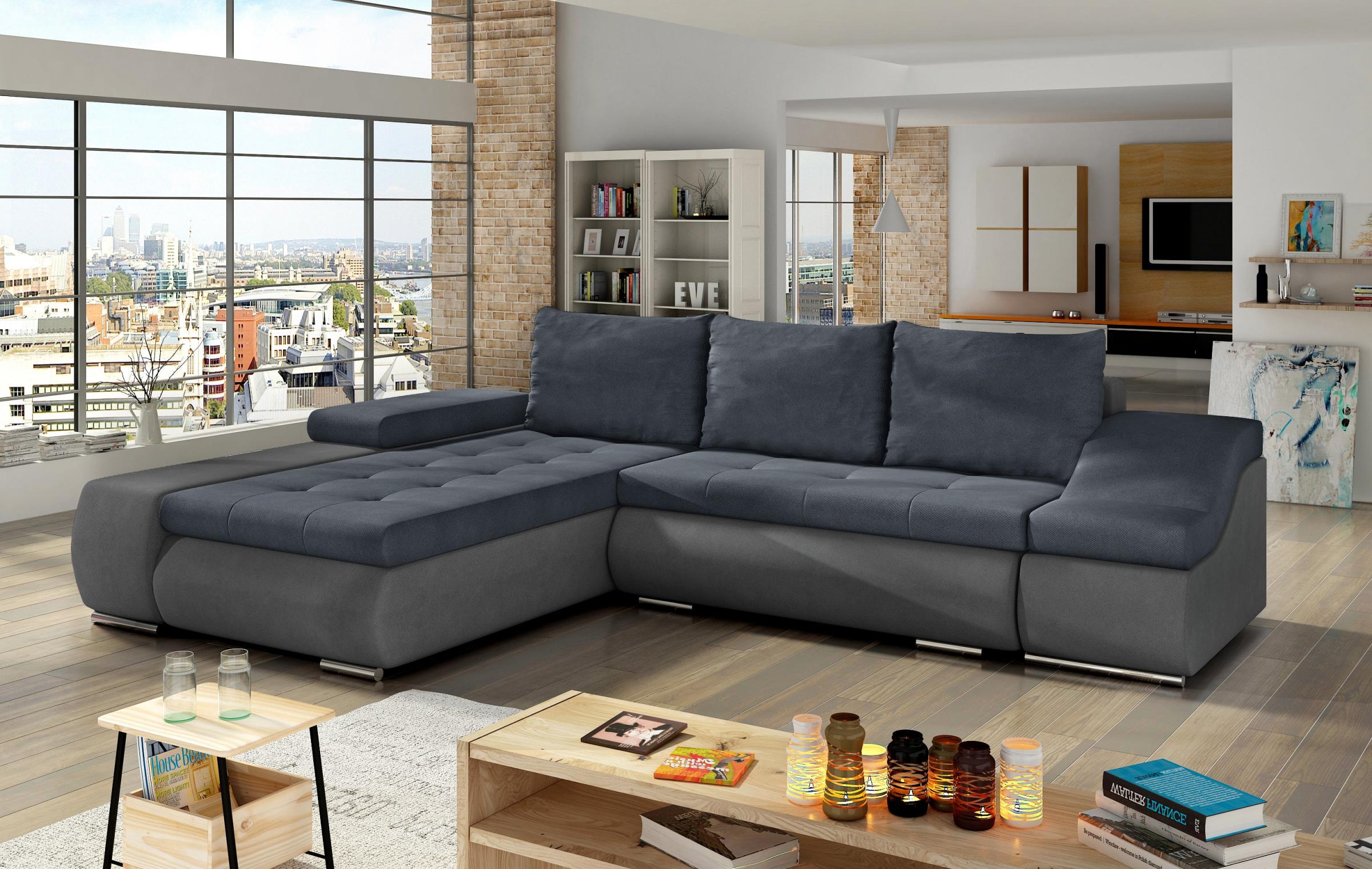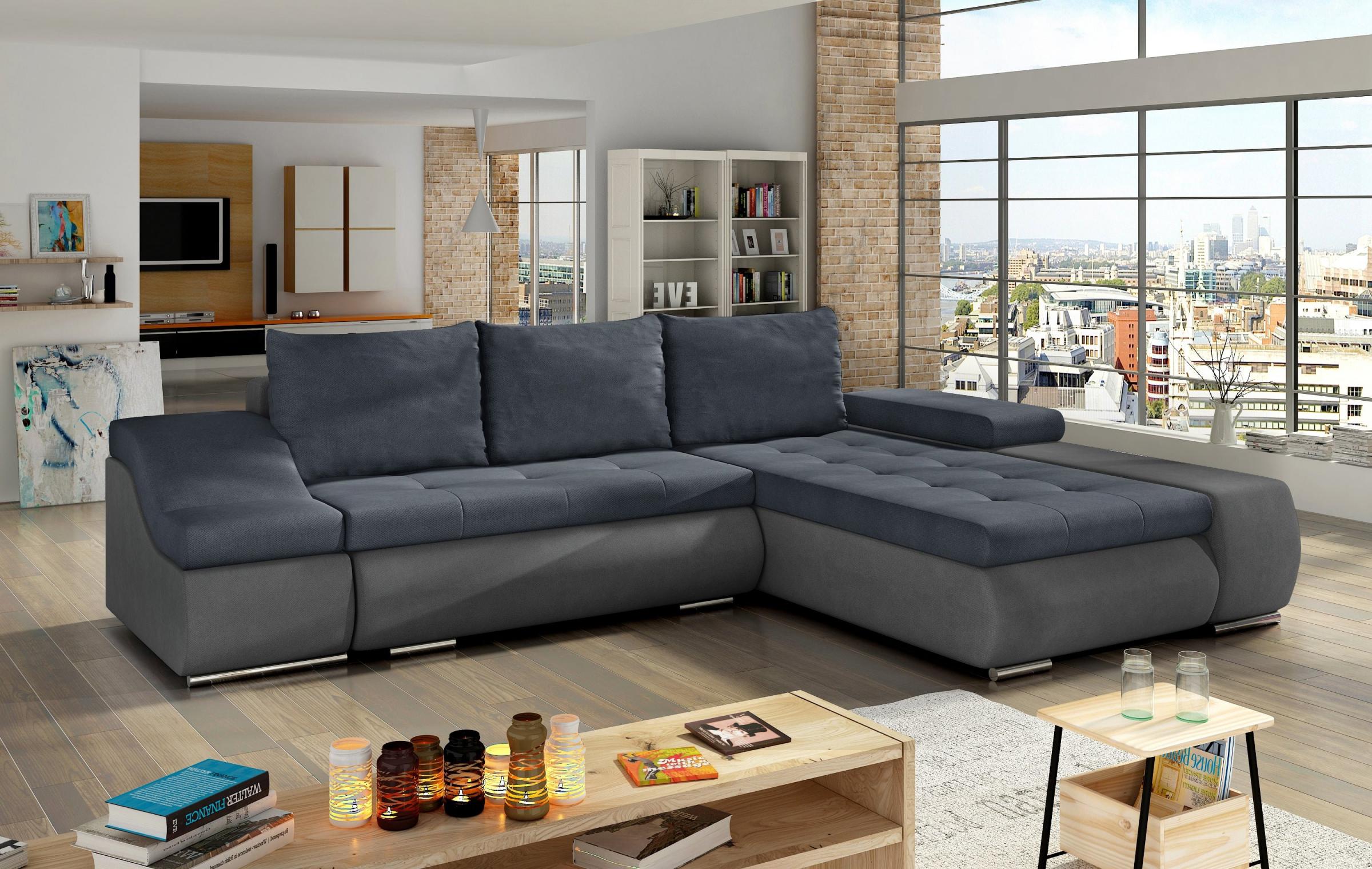 La distribución clásica del sofá esquinero Ontario, que permite integrar libremente los muebles en el espacio del salón, se ha enriquecido con elementos decorativos únicos, gracias a los cuales gana en singularidad y elegancia. Un reposabrazos ampliado en un lado, enriquecido con un reposacabezas adicional, se traduce en comodidad durante el descanso. El otro lado del sofá esquinero está equipado con un reposabrazos ondulado más corto que puede utilizarse como asiento adicional. Los bordes redondeados de los muebles, las elegantes patas decorativas, los amplios cojines que realzan el respaldo y el acolchado excepcionalmente sutil crean un efecto general que deleita a los amantes de los muebles modernos. El sofá esquinero cuenta con un material tapizado bicolor de primerísima calidad, resistente a la suciedad, la abrasión y la decoloración. Debido a que los cojines, el asiento y la parte superior de los reposabrazos tienen una tonalidad diferente al resto del mobiliario, el modelo Ontario se puede modificar libremente seleccionando materiales a juego o contrastantes.