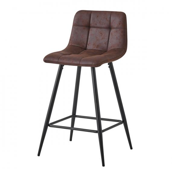 Taburete alto tapizado en tela color chocolate con acolchado a cuadrados en la parte delantera y patas metálicas en color negro. Se sirve en cajas de 2 uds.